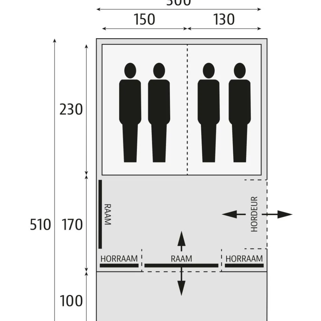 - Leefruimte: 170 x 300 cm met 210 cm stahoogte (achterzijde 190 cm): ideaal om binnen te tafelen of spelen bij minder weer.