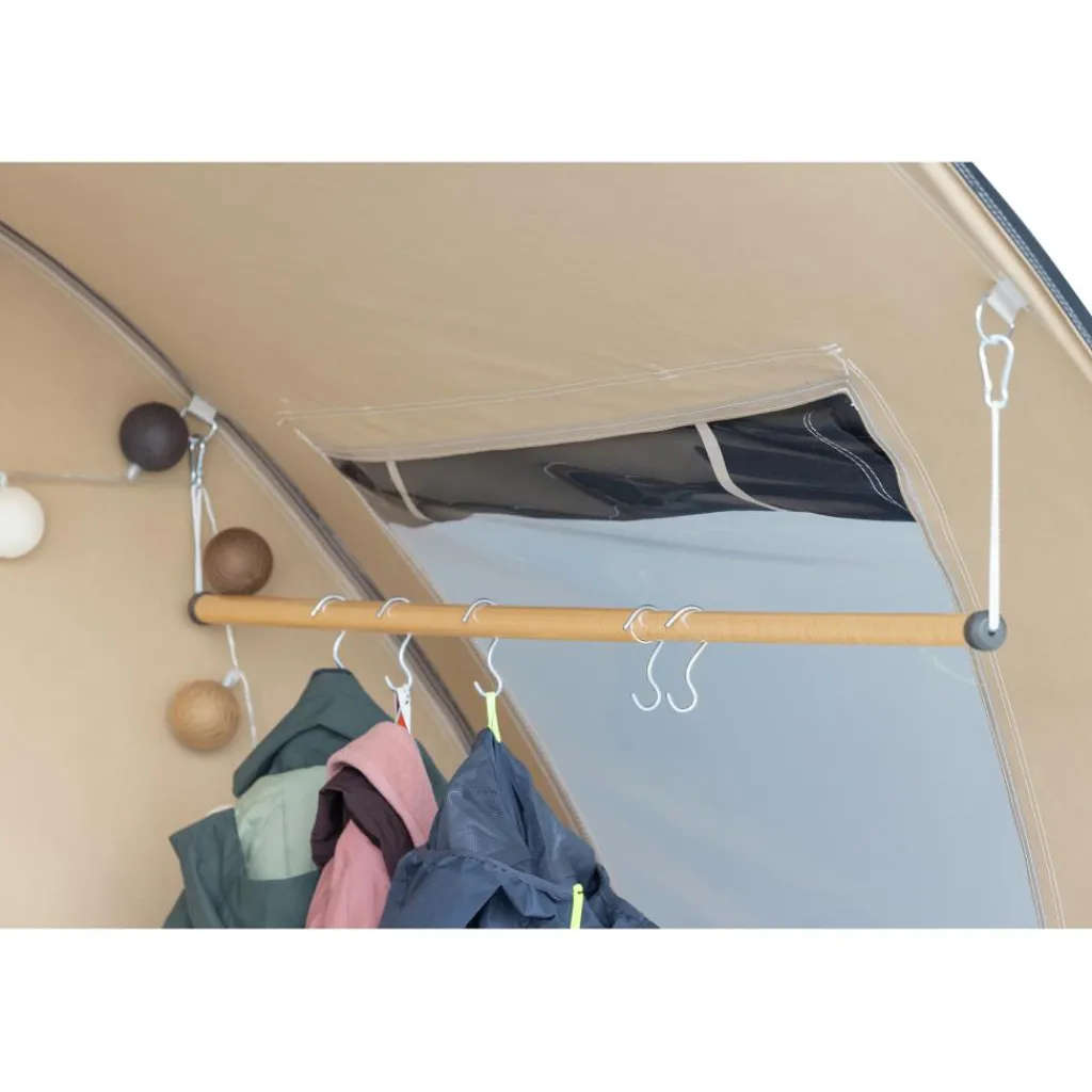 Het buitendoek bestaat uit 310 g/m² katoen, waardoor de tent natuurlijk ademt en condensvorming beperkt blijft. Dat voelt frisser aan bij warm weer en helpt juist bij wisselvallig weer om het binnenklimaat stabiel te houden. Het vaste bisonyl grondzeil sluit kuipvormig aan op de wanden, zodat spatwater, vuil en ongedierte buiten blijven en u de leefruimte eenvoudig schoonhoudt. De aluminium tentstokken combineren stijfheid met relatief laag gewicht, wat niet alleen voor stormvaste booglijnen zorgt maar ook het opzetten lichter maakt.