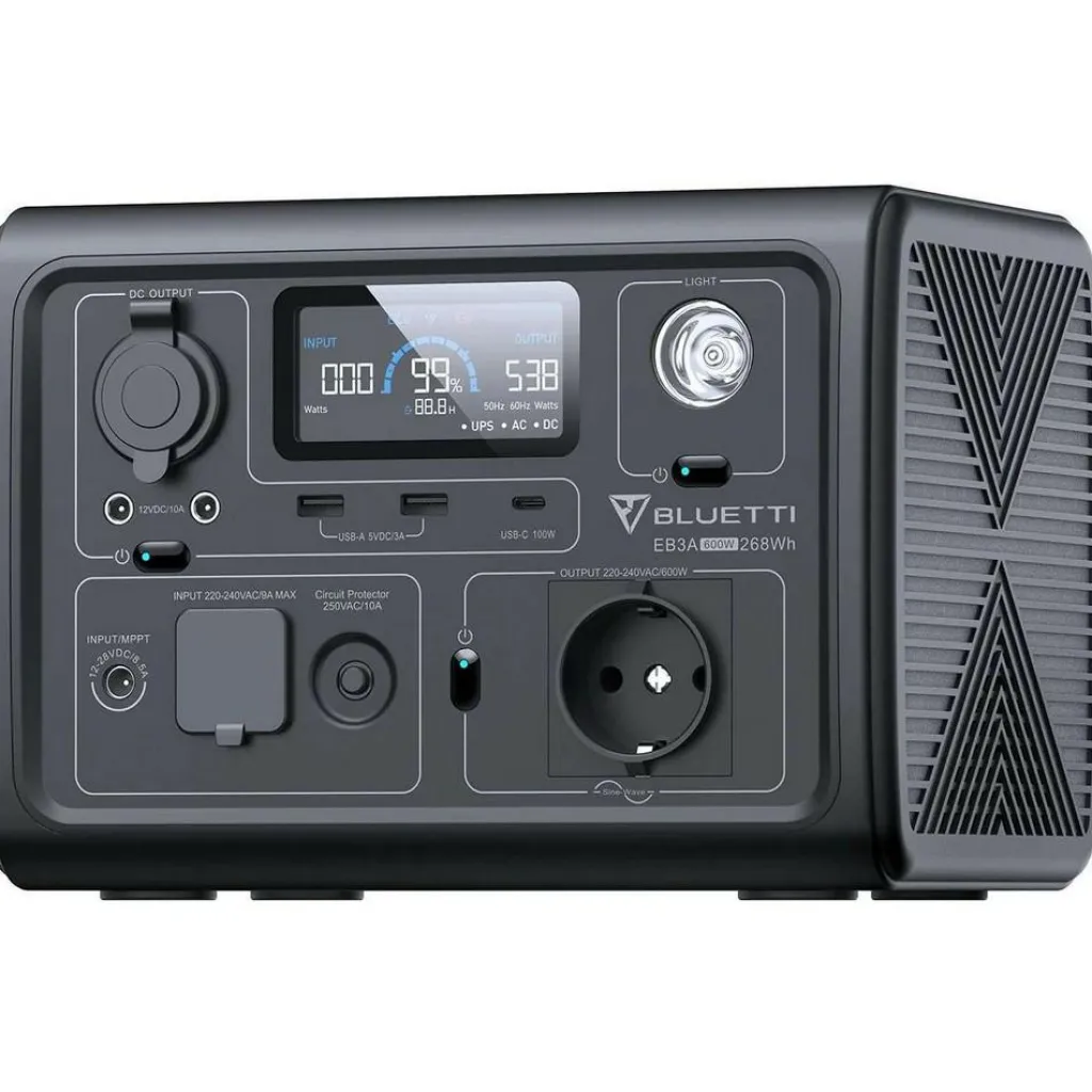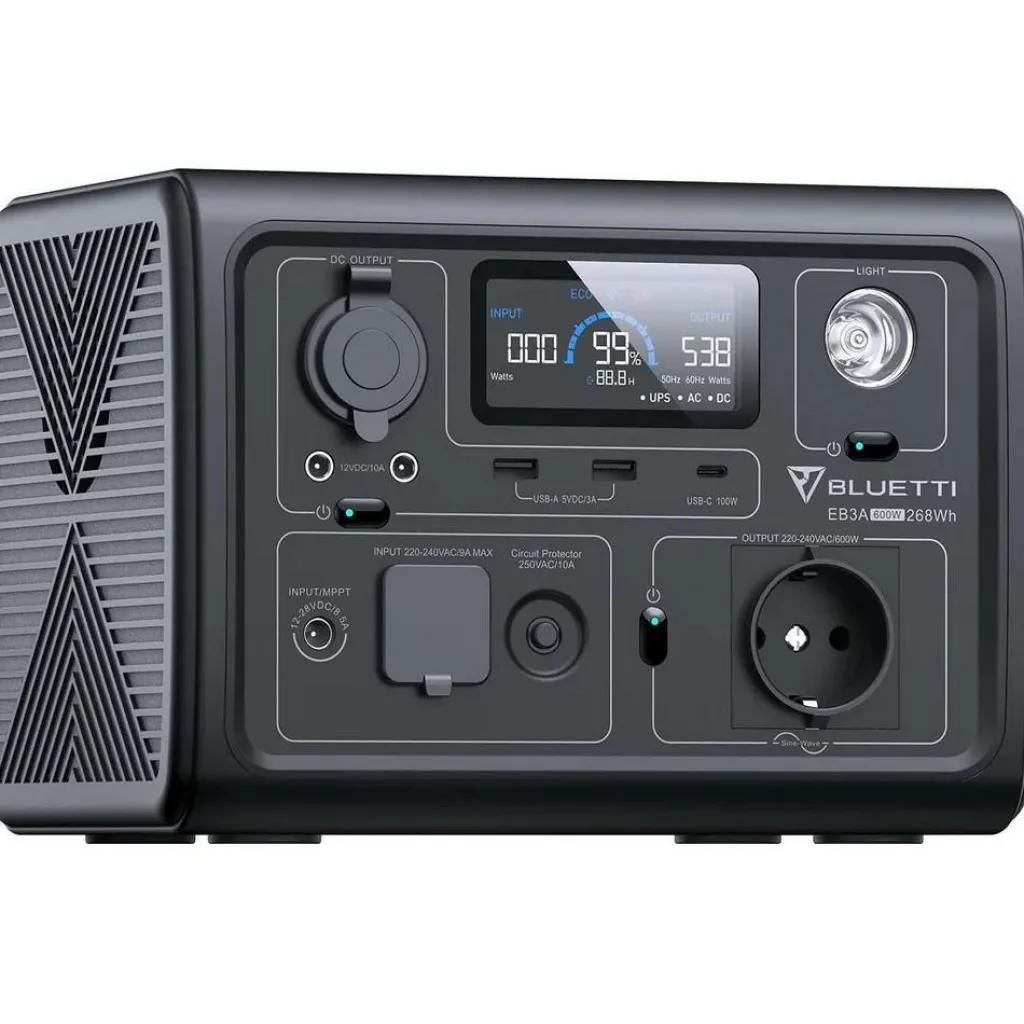 De Bluetti EB3A Portable powerstation is de ideale oplossing voor al uw stroombehoeften onderweg. Met een 268Wh lithium-ionbatterij en een maximaal uitgangsvermogen van 600W is de EB3A betrouwbaar en veelzijdig. Dankzij het compacte ontwerp is deze powerstation gemakkelijk draagbaar. Met meerdere uitgangen, waaronder AC, USB, DC en draadloos laden, kunt u verschillende apparaten tegelijkertijd opladen. Verder is de accu compatibel met zonnepanelen, biedt deze Powerstation een betrouwbare stroombron, zelfs in afgelegen gebieden.
