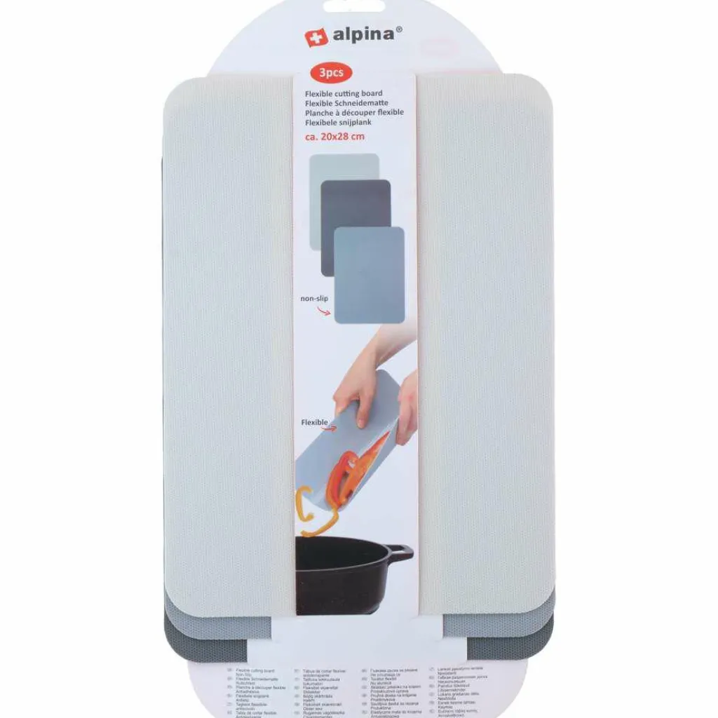 Deze Alpina Flexibele snijplankset bestaat uit drie snijplanken die licht van gewicht en flexibel zijn, erg handig als u de plank wilt vouwen om zo de ingrediënten in de pan te laten vallen. Ook zijn de snijplanken antislip gevoelig zodat u comfortabel uw ingrediënten kunt snijden.