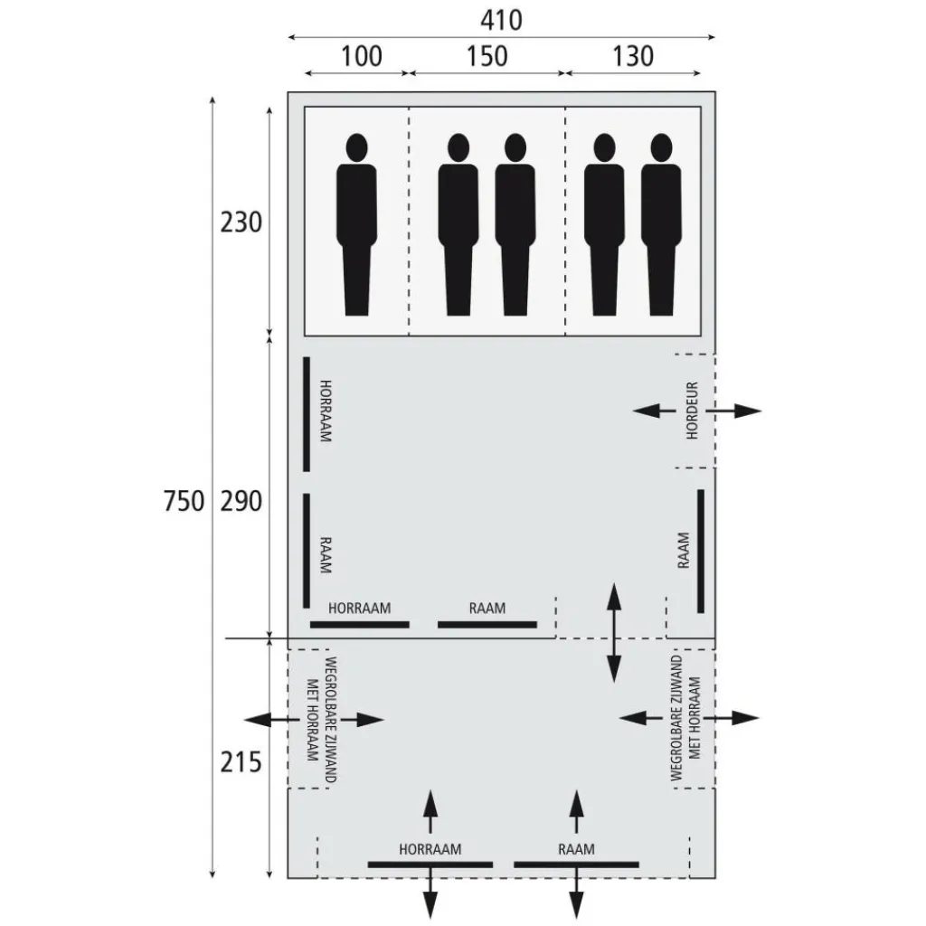 Aan de voorkant vindt u een diepe luifel van 215 x 410 cm met een combiwand en wegrolbare zijdeuren. Dankzij de afsluitbare horramen ventileert u royaal zonder insecten binnen te laten en past u de beschutting aan het weer aan. Zo creëert u eenvoudig een droge instap en extra schaduw voor de leefruimte.
