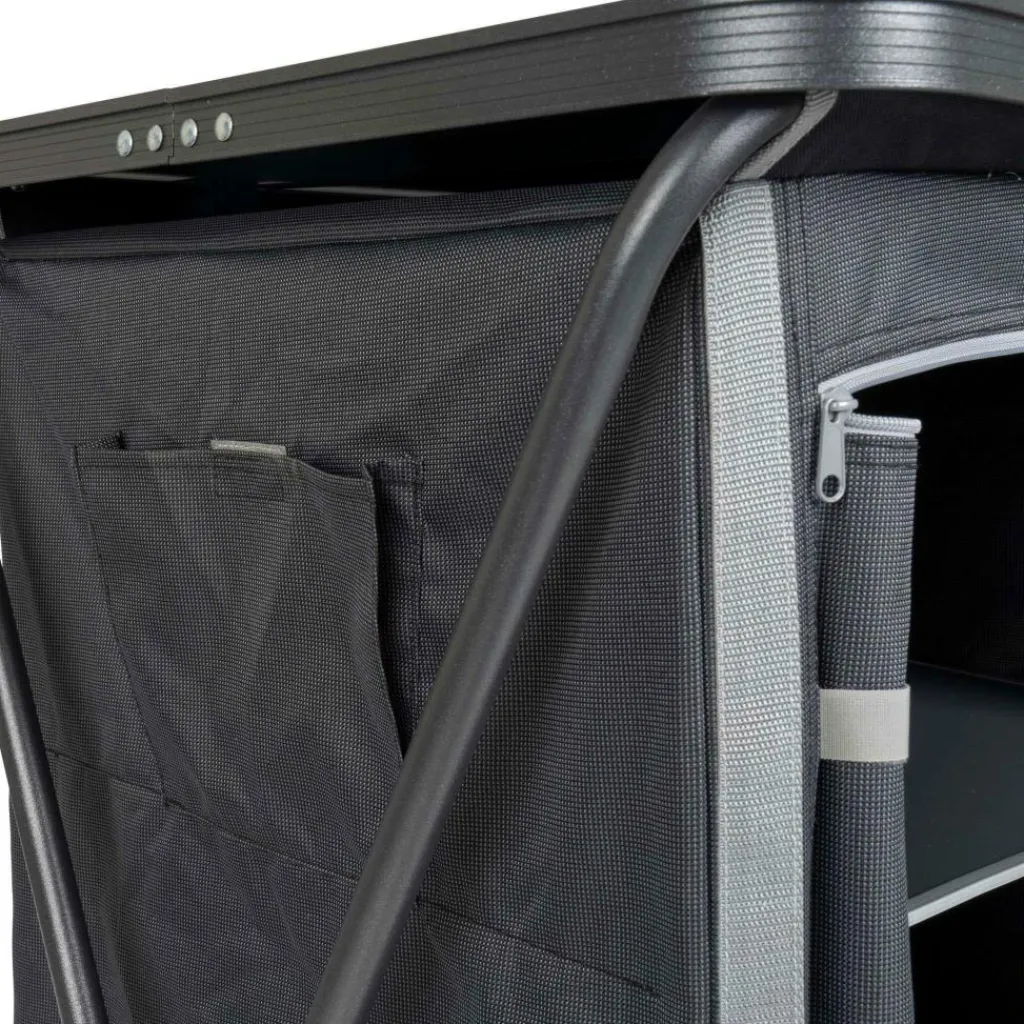 De Bardani Ripiani X6 campingkast is uitgevoerd met een grijs 600 D polyester doek. Daarnaast heeft de Bardani campingkast een aluminium frame en een MDF blad. Dankzij dit blad kunt u naast spullen in de kast ook spullen op de kast leggen. De kampeerkast heeft in totaal 6 schappen.