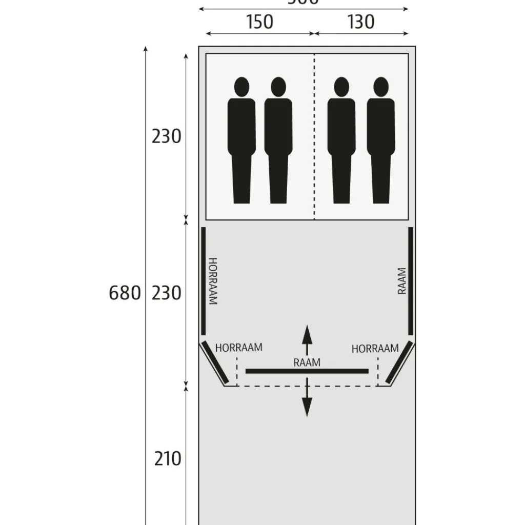 Achterin liggen twee slaapcabines: één van 230 x 150 cm en één van 230 x 130 cm. De extra diepte van 230 cm geeft ruimte aan lange luchtbedden of dikkere matrassen zonder dat voeten het doek raken. De scheidingswand is afritsbaar, zodat u eenvoudig één grote familiecabine creëert of juist twee afzonderlijke slaapplekken houdt. Dankzij horrengaas-openingen blijft de lucht fris en de muggen buiten.