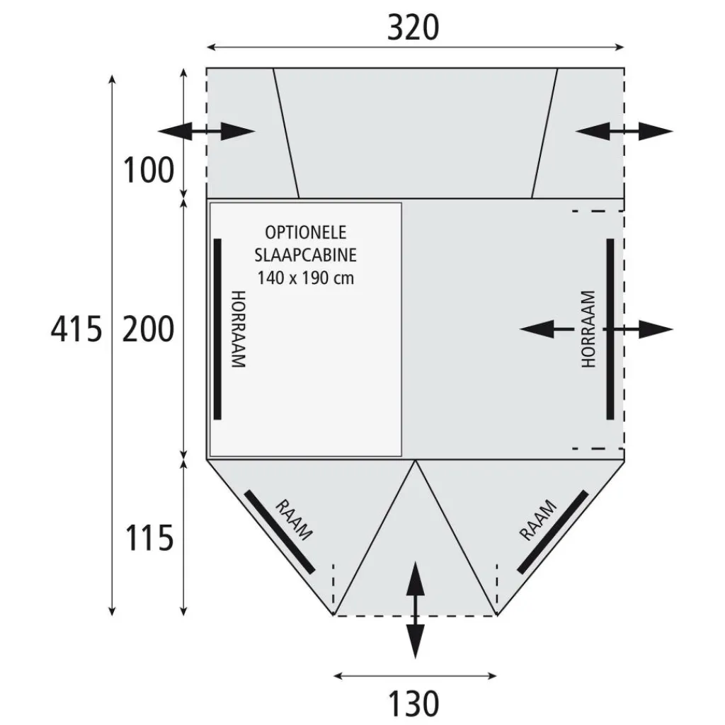 Met afmetingen van 415 × 320 cm biedt de leefruimte royaal plaats voor tafel en stoelen, terwijl de stahoogte van 220 cm rechtop bewegen zonder bukken mogelijk maakt. Het vaste kuipgrondzeil creëert één vlakke, drempelloze vloer. In de leefruimte is een aangewezen plek voorzien voor een apart verkrijgbare slaapcabine: zo voegt u eenvoudig een extra slaapplek toe zonder de leefruimte te verliezen. De aansluitsluis fungeert als beschutte doorgang tussen bus en tent. U kunt de tent loskoppelen en wegrijden, terwijl de tent netjes blijft staan tot u terugkomt.