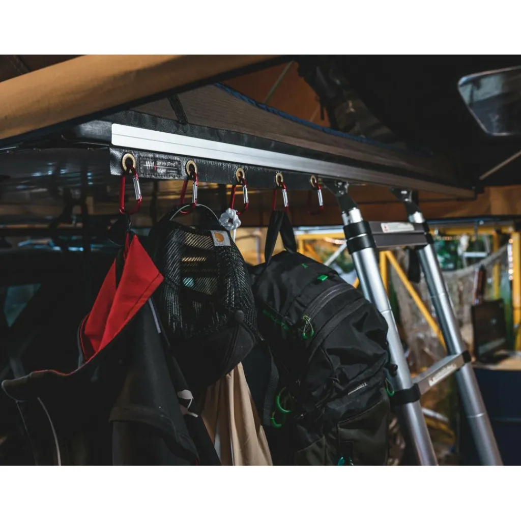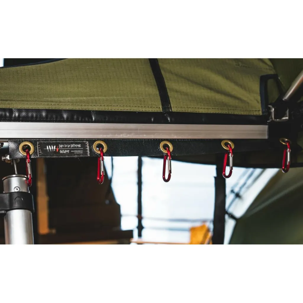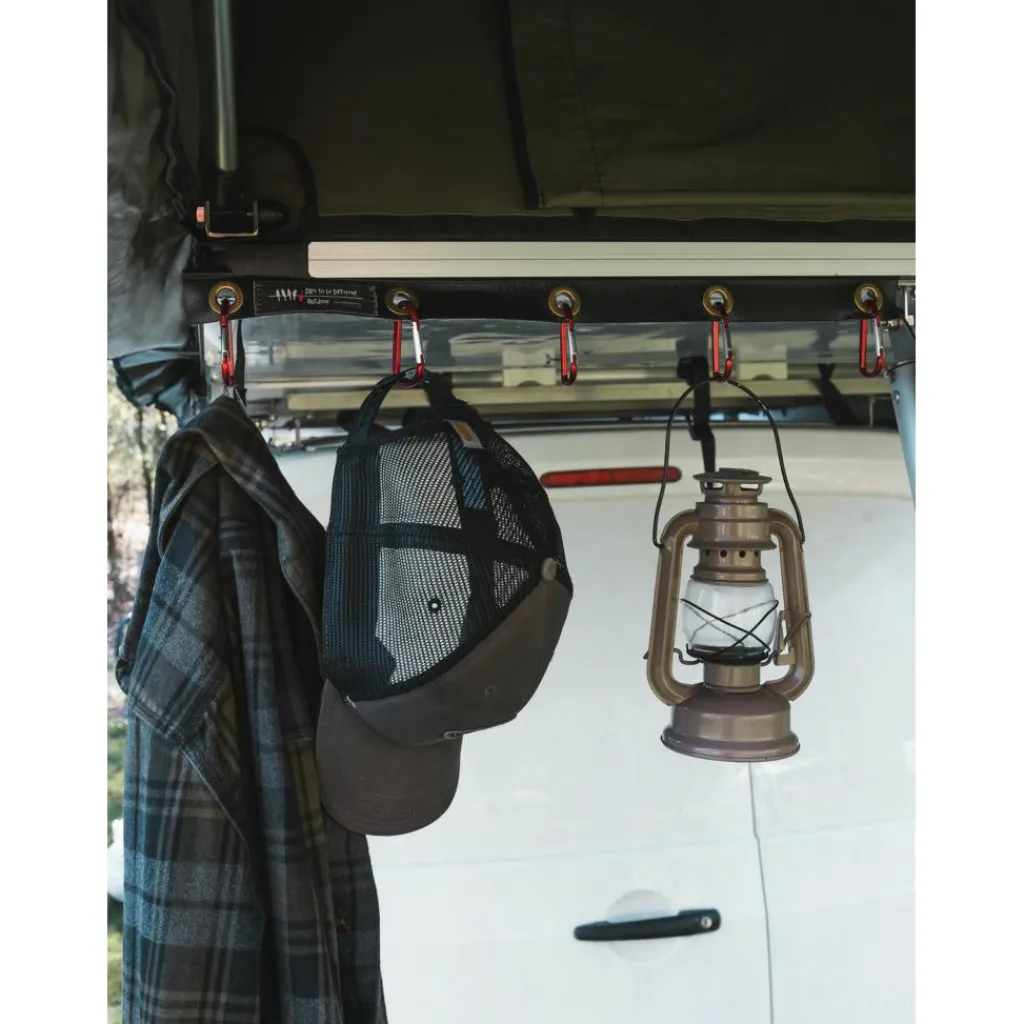 De Dare to be Different Outdoor Ezi Sky Clips accessoire set bestaat uit vijf karabijnhaken en een bijbehorende pees die met gemak in de peesrand geschoven kan worden van de daktent. Elke karabijnhaak heeft een draagvermogen van vijf kilogram. Deze haken zijn ideaal om te gebruiken om uw jassen, handoeken of rugzakken aan op te hangen.