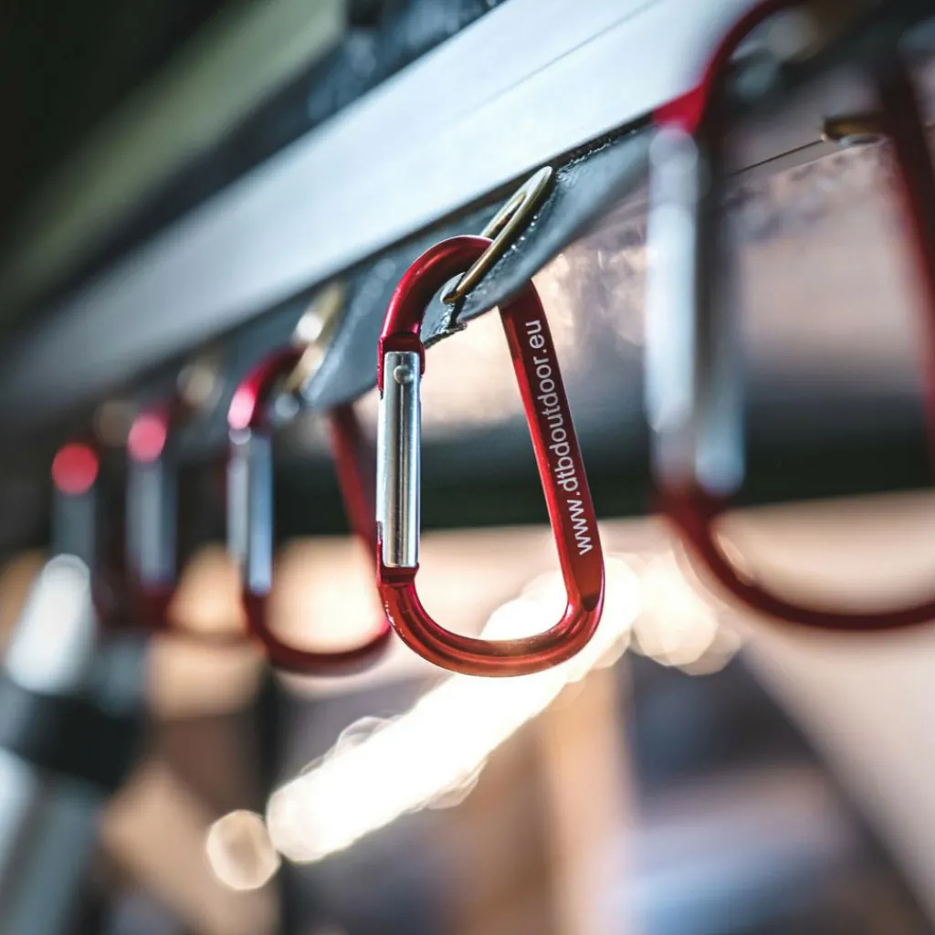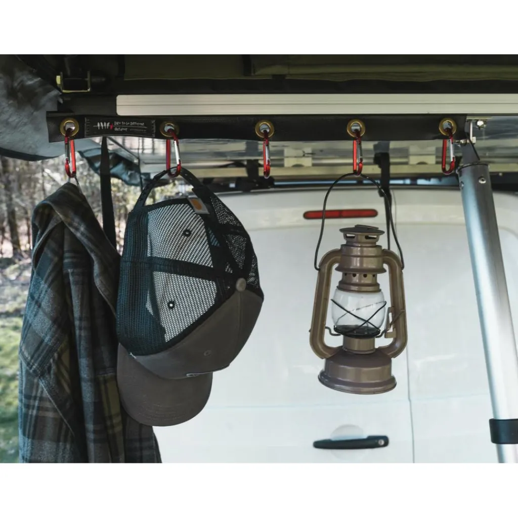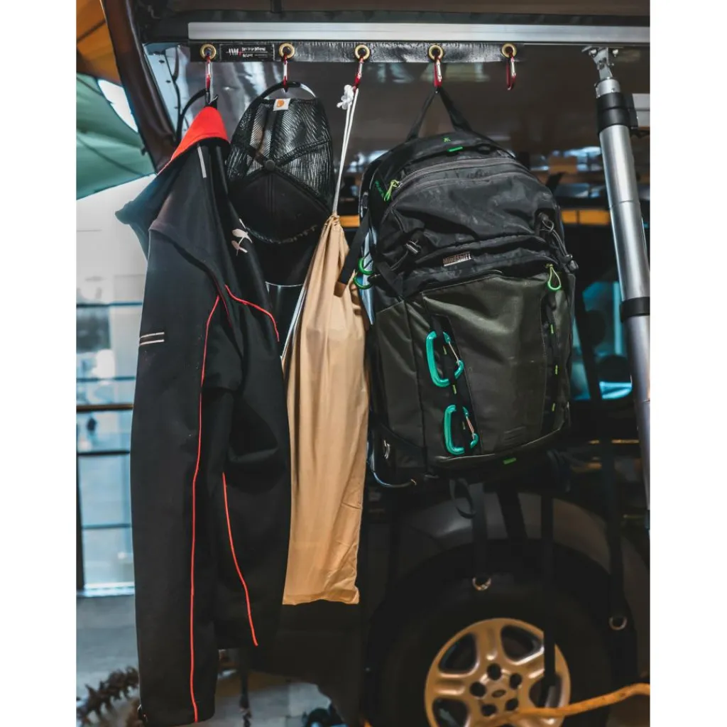 De Dare to be Different Outdoor Ezi Sky Clips accessoire set bestaat uit vijf karabijnhaken en een bijbehorende pees die met gemak in de peesrand geschoven kan worden van de daktent. Elke karabijnhaak heeft een draagvermogen van vijf kilogram. Deze haken zijn ideaal om te gebruiken om uw jassen, handoeken of rugzakken aan op te hangen.