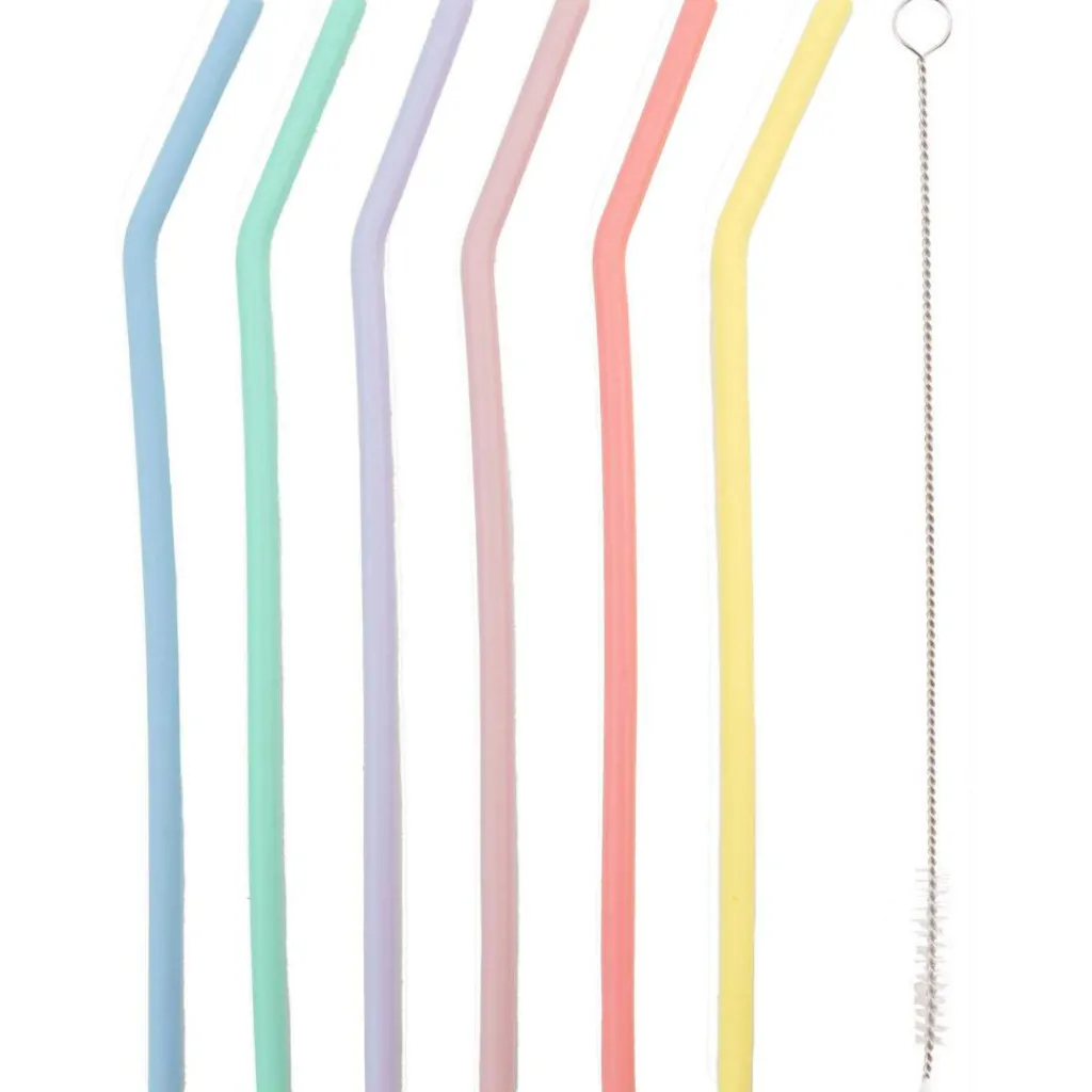 Deze Dotz gebogen siliconen rietjes worden geleverd per set van zes, inclusief een handig schoonmaakborsteltje. De herbruikbare rietjes hebben vrolijke kleuren en zijn een duurzaam alternatief voor wegwerpvarianten.