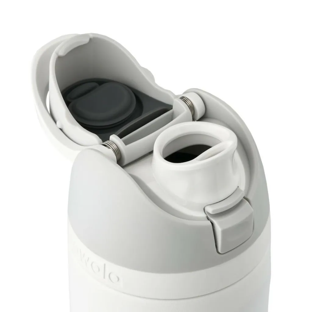 De Owala FreeSip drinkfles 710 ml shy marshmallow is een vrolijke fles van roestvrij staal en BPA-, Lood- en Ftalaatvrij tritan. U kunt op twee manieren uit deze drinkfles van Owala drinken, rechtop met behulp van het rietje of kantelend via de brede opening. Deze fles is eenvoudig te openen door middel van de handige knop en kan na gebruik weer vacuümgeïsoleerd vastgeklikt worden. Daarnaast is deze fles lekvrij en makkelijk schoon te maken. De deksel kunt u op het bovenste rek van de vaatwasser kwijt en de beker is dankzij de brede opening makkelijk met de hand schoon te maken. Bovendien kunt u dankzij deze brede opening ook ijs aan uw drinken toevoegen en de fles zelf houdt uw water tot 24 uur heerlijk koud. Neem de fles verder overal mee naartoe met de handige draaglus.