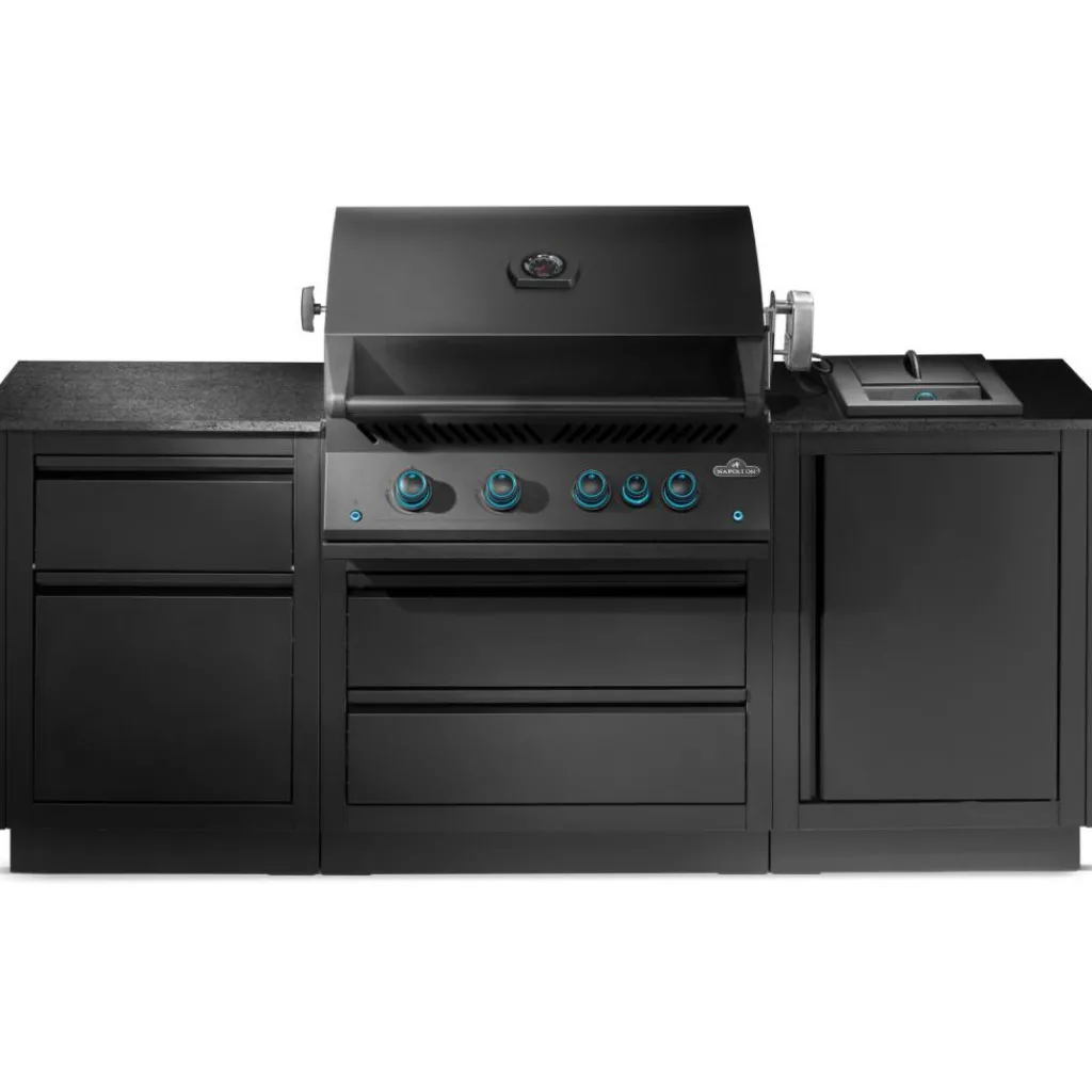 De Napoleon Oasis Compact 105 buitenkeuken matte black biedt een luxe en ruimtebesparende oplossing voor iedere buitenruimte. Deze hoogwaardige buitenkeuken is voorzien van de krachtige inbouwbarbecue 700 Serie 32, inclusief Sizzle Zone infrarood zijbrander en een infrarood achterbrander, waardoor u moeiteloos een breed scala aan gerechten kunt bereiden. Met een totaal grilloppervlak van 5.064 cm² en een vermogen van 21,5 kW, beschikt u over voldoende ruimte en kracht om op professioneel niveau te grillen. De barbecue is voorzien van vier RVS hoofdbranders, een Jetfire-ontstekingssysteem en wordt geleverd met hoezen voor de barbecue en zijbrander.