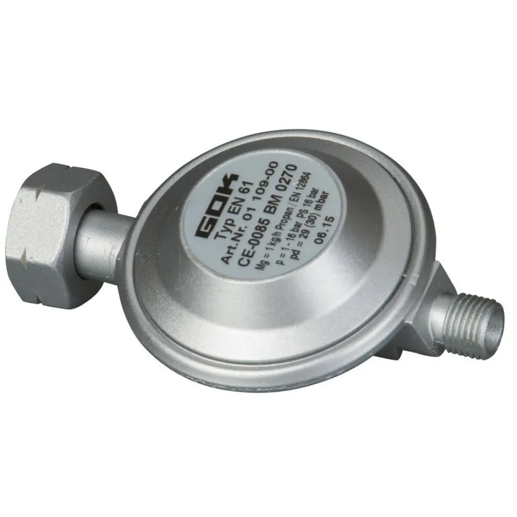 De universele gasdrukregelaar van 30 mbar van GOK heeft een universele aansluiting en een capaciteit van 1 kg per uur. Een drukregelaar koppelt een gasfles aan de gasinstallatie en zorgt voor een constante en juiste druk op de aangesloten apparatuur. De reguliere druk op een gasfles is bij 15 °C circa 7 bar. Dat is te hoog en bovendien onregelmatig en dat levert problemen in de aangesloten apparatuur op. Daarom is een drukregelaar nodig.