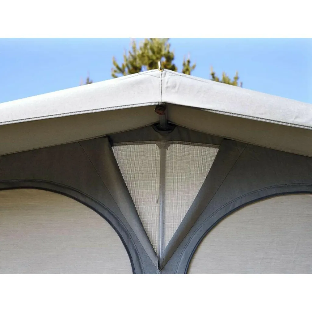 - Voor- en zijpanelen met ritsen: panelen zijn op te rollen voor een brede entree en extra openheid op warme dagen.