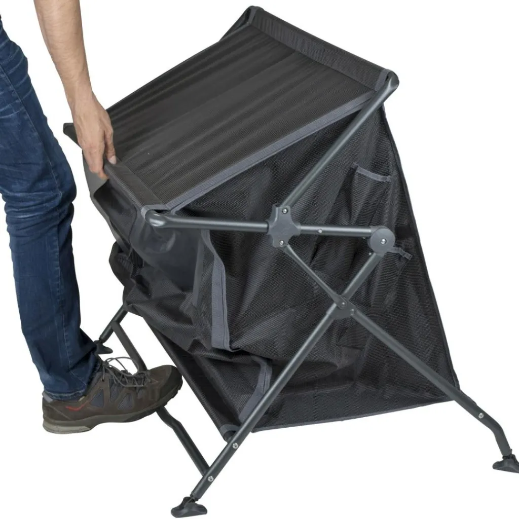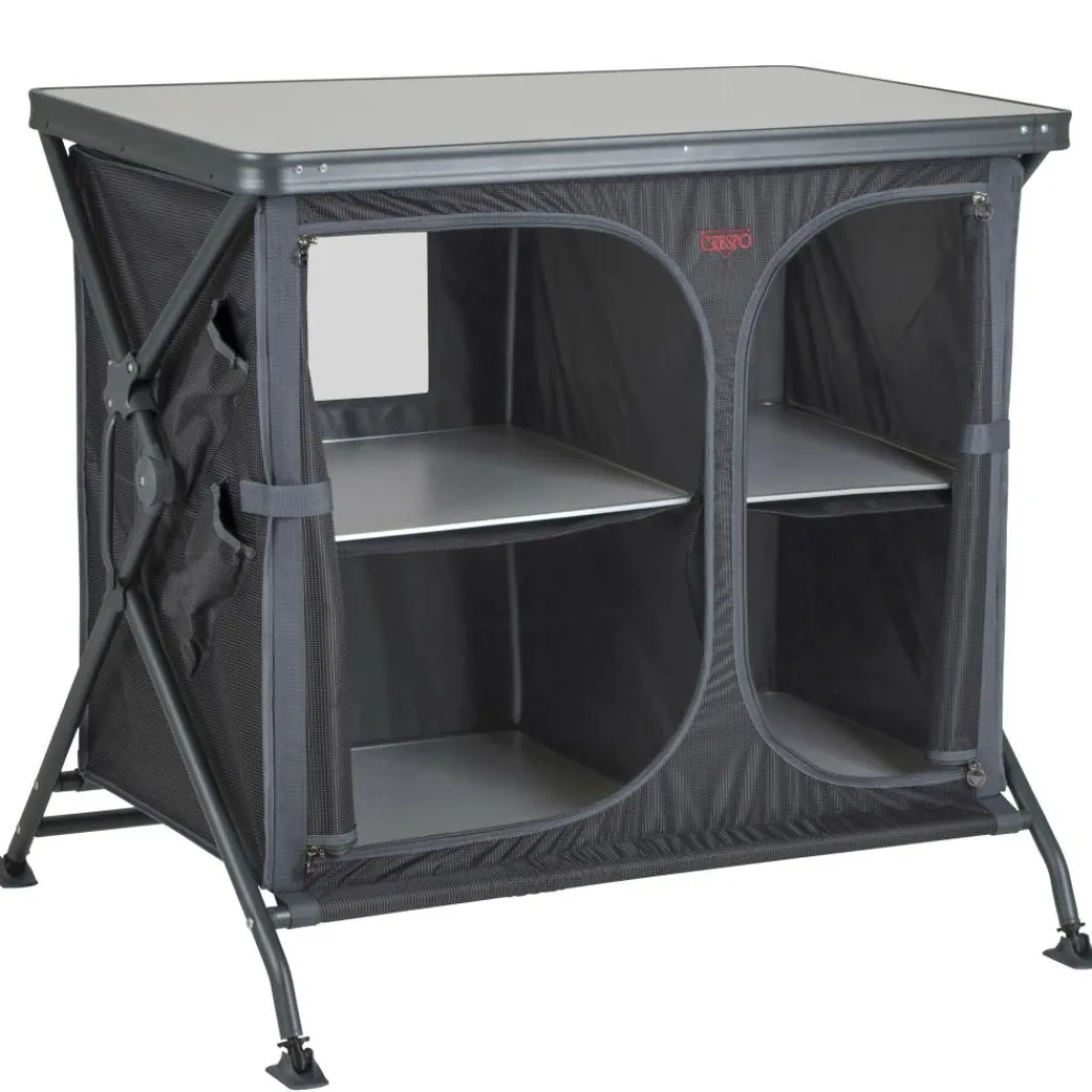 De AP/105 kookkast van Crespo is een stevige, stabiele campingkast met een grijs oplegblad van melamine. Dit blad is bestand tegen krassen en belangrijker nog, tegen hitte. De behuizing van de kast is van stijlvol zwart aluminium met daarom om heen een hoes van stevig polyester. De kast heeft vier handige legplanken, een mesh raam aan de achterkant en vier opbergvakken aan de zijkant. Het kookeiland is zeer eenvoudig op te zetten door middel van een uniek in- en uitklapsysteem. En is vervolgens stabiel neer te zetten door de verstelbare poten met stabilisatoren, welke afzonderlijk van elkaar af te stellen zijn.