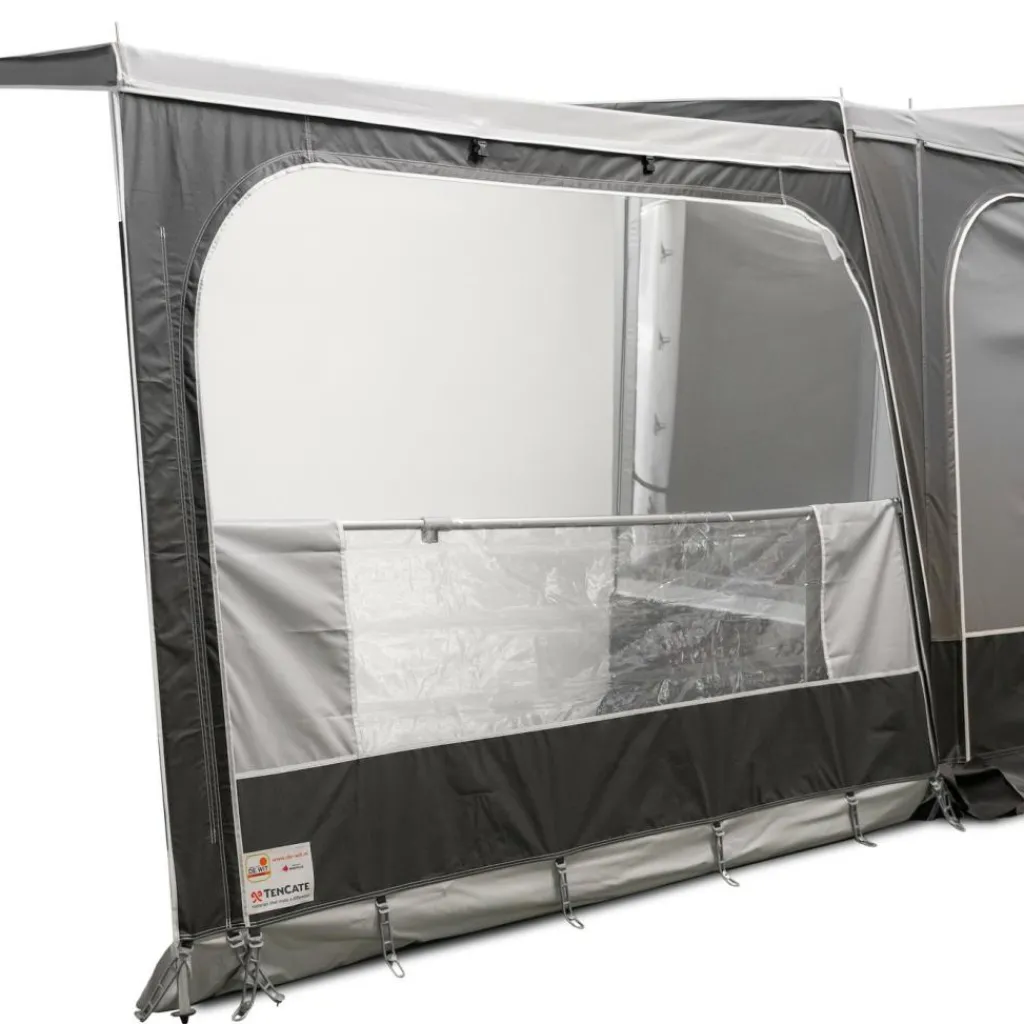 De wanden zijn uitgevoerd in All Season tentdoek in de kleur Terrazzo grijs. Dat betekent robuust materiaal voor herhaaldelijk gebruik gedurende het seizoen, met een stevige greep die beschutting biedt tegen wind en lichte neerslag en makkelijk te reinigen is na uw trip. De buistunnels zijn voorzien van een rits, waardoor u de wanden soepel rondom het frame voert en strakker kunt afspannen voor een nettere, stillere afwerking. Heldere raamvlakken zorgen voor daglicht in uw zithoek, terwijl het uitritsbare raamdeel snel extra lucht doorlaat wanneer de zon doorkomt.