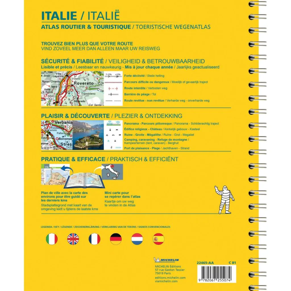 De Michelin Italië wegenkaart is een atlas met wegenkaarten van A4-formaat en een schaal van 1 : 300.000. Deze wegenkaart van Michelin wordt bij elkaar gehouden met een ringband en is zeer uitgebreid. U vindt hierin informatie over pittoreske routes, mooie bezienswaardigheden, belangrijke verkeersinformatie en kampeerterreinen. Bovendien bevat de atlas 53 stadsplattegronden.