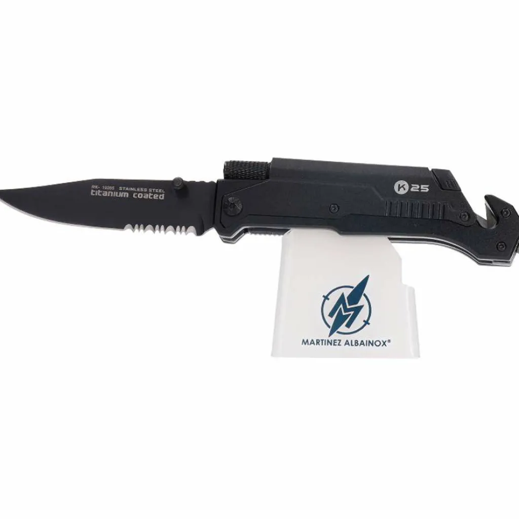 Het K25 Tactical 19265 zakmes heeft een lemmet met zowel een gladde als een kartelrand, wat het zeer veelzijdig maakt. Het handvat is uitgerust met een gordelsnijder, glasbreker en een vuurstarter. Dit mes is gemaakt van duurzaam RVS en heeft een titanium coating voor extra bescherming. Bovendien wordt het mes geleverd met een handige riemetui.