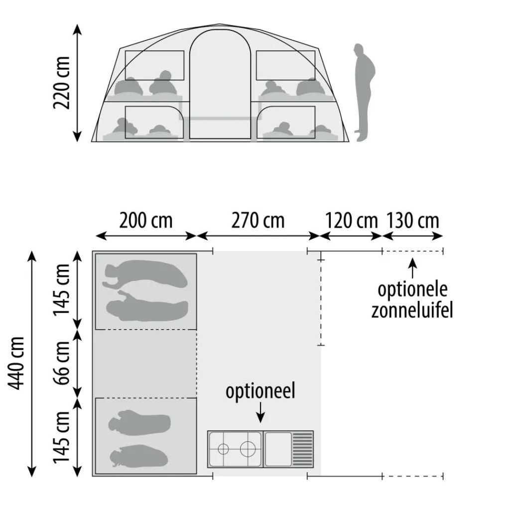 De Manga Basic wordt geleverd met een standaard luifel vast aan de voortent, waaraan een extra zonneluifel kan worden bevestigd om een grote schaduwrijke ruimte te creëren. Hierdoor kunt u buiten genieten van de verkoeling. In de tent en de slaapgedeeltes zorgen ventilatieramen voor frisse lucht, terwijl het horrengaas insecten buiten houdt.