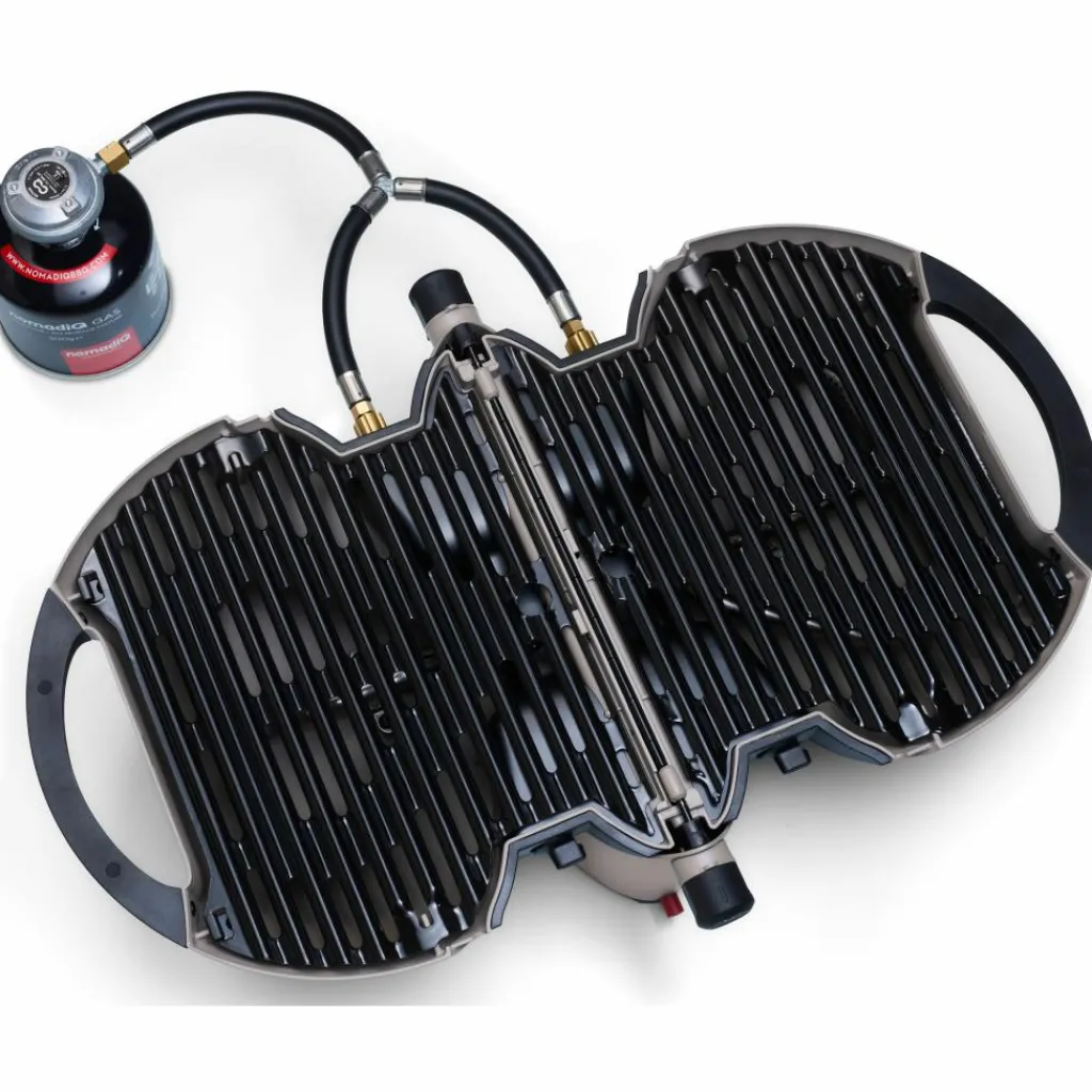 Om deze NomadiQ tafelbarbecue te gebruiken, hoeft u deze alleen maar uit te klappen, aan te sluiten op een wegwerpbare gasfles (niet inbegrepen) en aan te zetten. De temperatuur van deze tafelbarbecue is in te stellen tussen de 150 en 350 en beide helften kunnen los van elkaar bediend worden. Daarnaast hebben de grillroosters een PFAS-vrije geëmailleerde antiaanbaklaag.