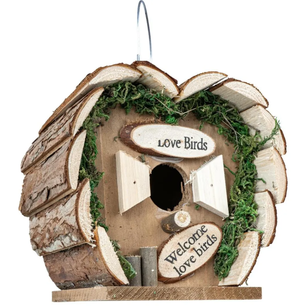 Dit schattige DWS Vogelhuisje Lovebird heeft een hartvormig design met een knusse en natuurlijke uitstraling. Het vogelhuis kan opgehangen of ergens neergezet worden in de tuin.