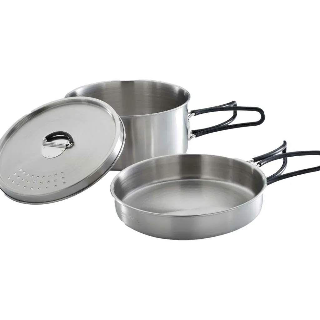 Onmisbaar voor uw avontuurlijke kookkunsten is de Trekking Kit pannenset van Campingaz. Deze set omvat een kookpan, een deksel en een bakpan. Gemaakt van hoogwaardig roestvrij staal, met handvatten van zacht silicone voor optimaal comfort. De afmeting van de kookpan is 14,5 x 6,5 cm en de bakpan is 15,5 x 3 cm.