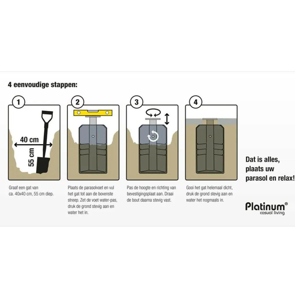 Met de Platinum ingraaf parasolvoet houdt u meer ruimte over op uw het terras, u heeft geen grote parasolvoet nodig en uw parasol staat stevig vast.
