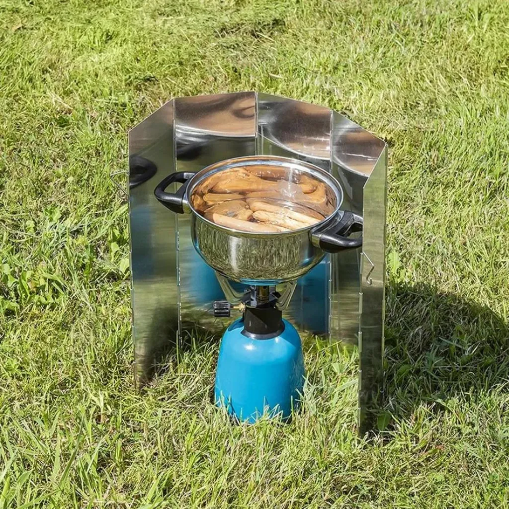 Het 5-delige kookwindscherm is volledig inklapbaar en ideaal voor gebruik op de camping met elektrische kooktoestellen of gasbranders. Het universele scherm voorkomt het uitwaaien van de vlam en zorgt voor betere warmtegeleiding richting de pan. Het scherm is voorzien van pinnen aan de uiteinden voor een stevige bevestiging in de grond.