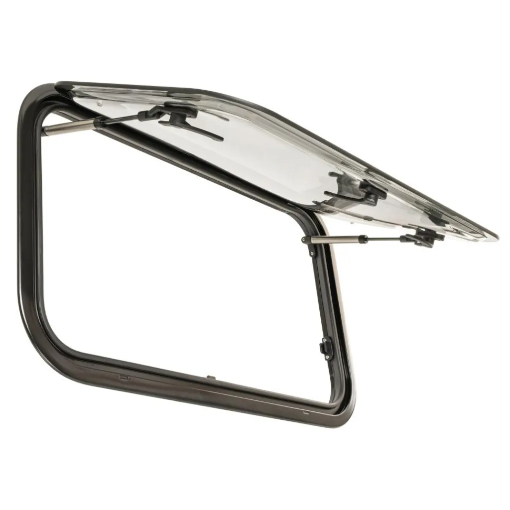 Het DWS Camping klapraam met een afmeting van 700 bij 350 millimeter is een stijlvolle toevoeging voor uw caravan of camper. Het binnenkader is voorzien van een hor en een verduisteringsgordijn met magneetsluiting. Het frame is vervaardigd uit sterk gepoedercoat aluminium. Het grijs getinte, dubbele acrylglas heeft een strakke uitstraling en is UV-bestendig. De veiligheidsgrendel maakt het mogelijk om het raam van binnenuit af te sluiten. Dankzij de telescopische armen kunt u het raam traploos in verschillende standen openzetten. Voor de montage kunt u eenvoudig het inbouwframe als sjabloon gebruiken.