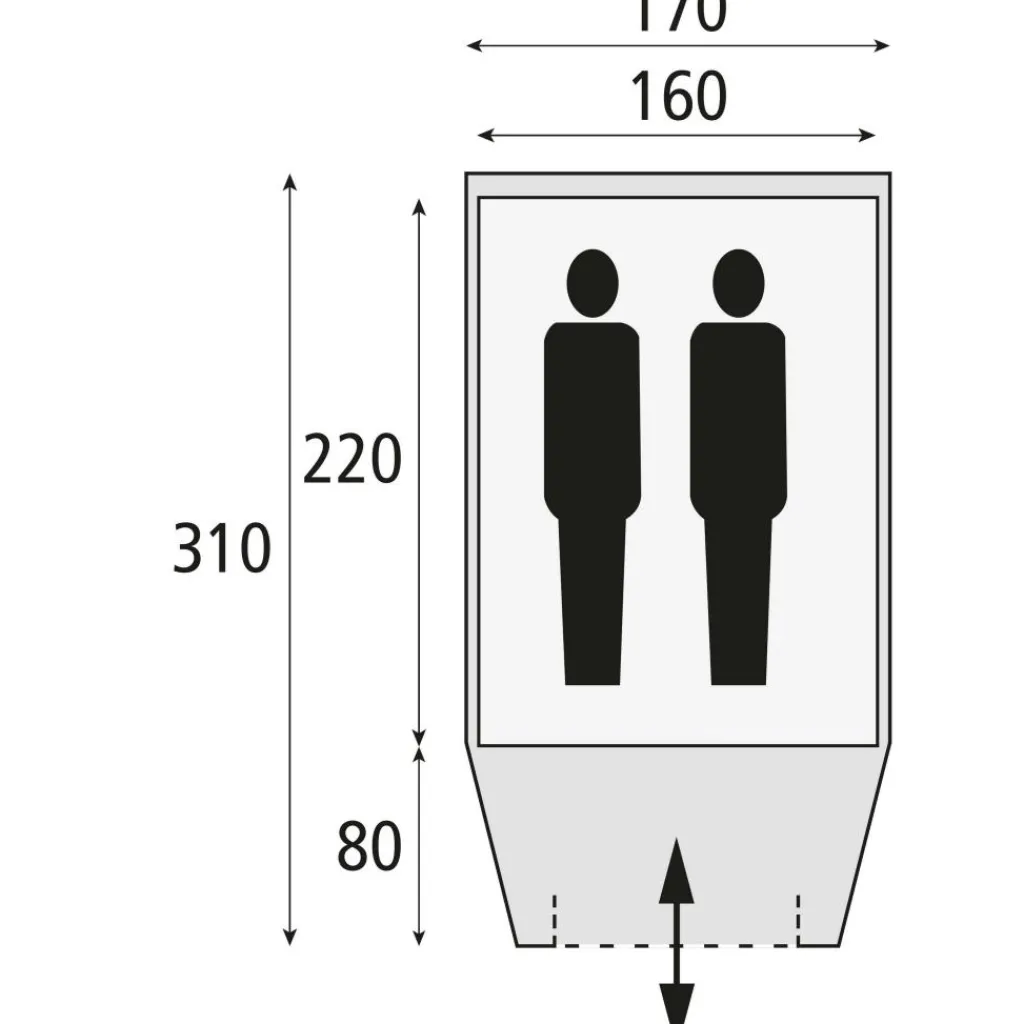 De Safarica Kenia 170 TC heeft één royale slaapcabine voor twee personen. Met een lengte van 220 cm en een breedte van 160 cm is er ruimte voor twee matten en houdt u nog plek over voor kleding of een tas bij het voeteneinde. De voorruimte van 80 x 160 cm biedt extra opbergruimte of ruimte voor een kookblok, zodat de slaapcabine schoon en overzichtelijk blijft. Met een maximale hoogte van 120 cm kunt u comfortabel zitten, schuilen bij een buitje en zich gemakkelijk omkleden, zonder dat de tent onnodig groot wordt op de kampeerplaats.
