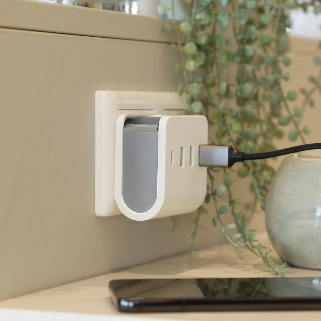 De SHI wandoplader heeft drie USB-A-poorten en één USB-C-poort. De compacte en duurzame constructie van de wandoplader zorgt ervoor dat u deze eenvoudig kunt meenemen, op reis of voor dagelijks gebruik. U kunt een apparaat op de wandoplader plaatsen.