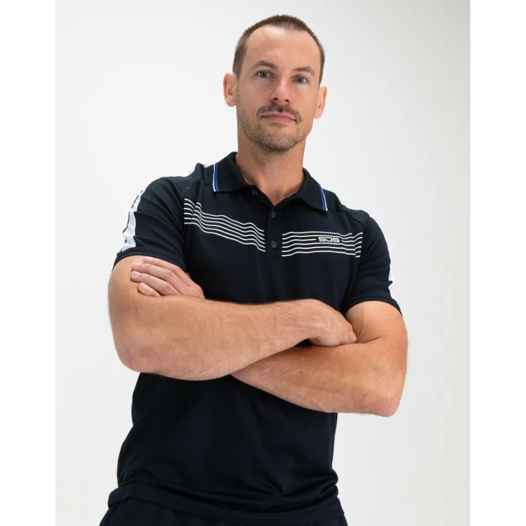 Met de Sjeng Sports Celio tennispolo voor heren maakt u een zeer sportieve indruk op de tennisbaan. Deze tennispolo van Sjeng Sports heeft een trendy look en is donkerblauw met witte en blauwe strepen op de borst, rug, mouwen en bij de kraag.