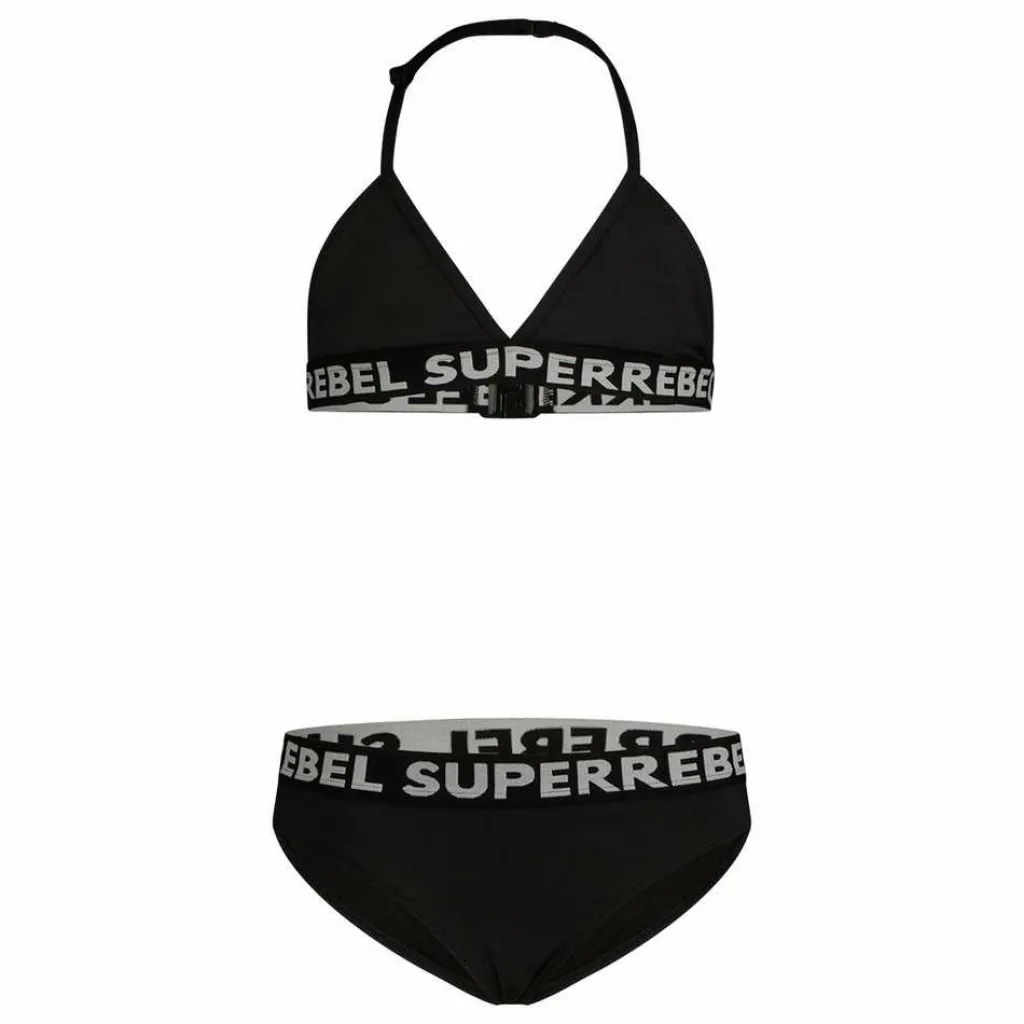 Deze SuperRebel Isla triangle bikini voor dames komt in de kleur black. Deze stijlvolle bikini heeft verstelbare bandjes die naar de nek toe lopen. Verder is de bikini afgewerkt met SuperRebel teksten voor een trendy look.