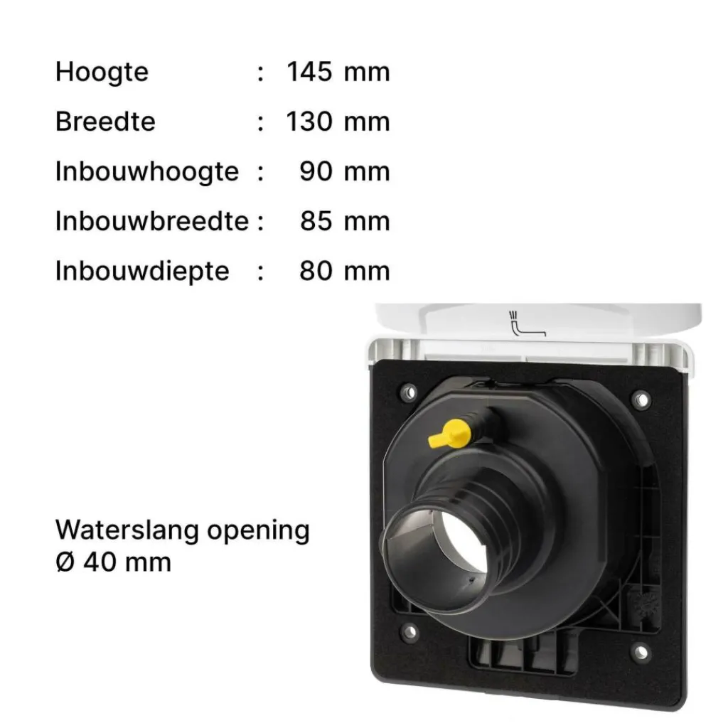 Inbouw wandinvoerdoos met een opening geschikt om een watertank op aan te sluiten. Een waterslang met 40 millimeter doorsnede kan gebruikt worden om de opening en een watertank en/of jerrycan op elkaar aan te sluiten. De invoerdoos voldoet aan KTW en W270 norm, dit houdt in dat het gebruikt kan worden voor drinkwater, en is gemaakt van UV-bestendig kunststof. Een stevig sluitende deksel houdt de binnenkant schoon en stofvrij.