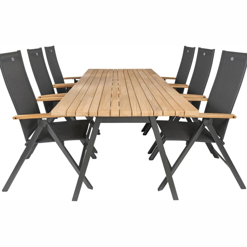 De Taste by 4 Seasons Ambassador 240 x 100 cm Aruba 6 tuinset is een 7-delige set die bestaat uit een robuuste tafel, gemaakt van aluminium en teakhout en 6 verstelbare stoelen gemaakt van textileen en aluminium. Hierdoor is de tuinset onderhoudsarm en heeft deze een lange levensduur. Kortom met een comfortabele Taste by 4 Seasons tuinset creëert u een stijlvolle en gezellige sfeer in uw tuin.