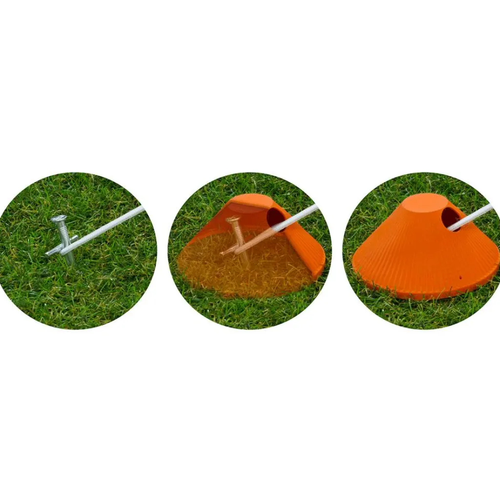 De Peg Bumper is aan de zijkant voorzien van een kleine opening waar de scheerlijn doorheen gaat. Schuif eerst de Peg Bumper over het uiteinde van de scheerlijn en bevestig daarna de scheerlijn, zoals u normaal gewend bent, aan de tentharing en sla de haring in de grond. Nu kunt u deze praktische accessoire over de haring laten zakken zodat u zich niet meer kunt stoten aan een haring of kan struikelen over een scheerlijn.