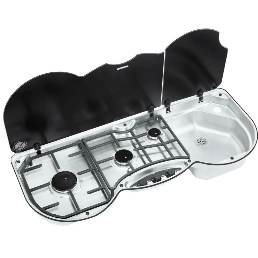 De Thetford 353R kook-spoelcombinatie rechts bestaat uit een spoelbak aan de rechterkant en 3 verschillende pitten voor grote of kleine pannen. Deze uitvoering heeft twee glasplaten, zodat u makkelijk extra werkruimte kunt creëren voor het bereiden van uw maaltijden. De 353L is gemaakt van hoogwaardig materiaal en is eenvoudig schoon te maken.