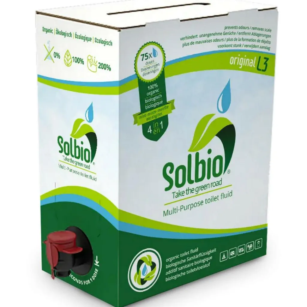 Solbe Original is een krachtige, natuurlijke toiletvloeistof geschikt voor porta potti’s, caravan, camper of boot. De 3 liter inhoud is goed voor 75 doseringen of 7 maanden gebruik (bij een 20 liter tank). De toiletvloeistof is gemaakt van volledig natuurlijke, biologisch afbreekbare ingrediënten met een frisse geur van eucalyptus, den en munt. De vloeistof breekt afval en papier effectief af, voorkomt nare geurtjes, gasvorming, kalkaanslag en urinesteen.