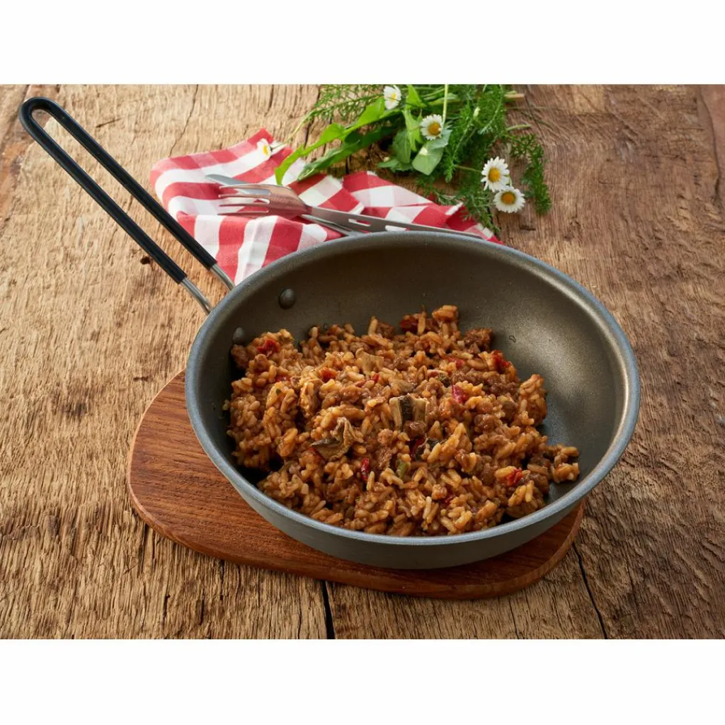 Deze maaltijd bevat: langkorrelrijst (47%), jus, zonnebloemoliepoeder (bevat melk, E551), rundvlees 10%, maltodextrine, champignons, aardappelmeel, gemodificeerd zetmeel, wei-eiwitconcentraat, paprika, tomaten, zout, peterselie, peper, voedingszuur: citroenzuur, rozemarijnextract en natuurlijk aroma. Gedroogd vleesgehalte: 16 g (komt overeen met ongeveer 63,5 g vers vlees).