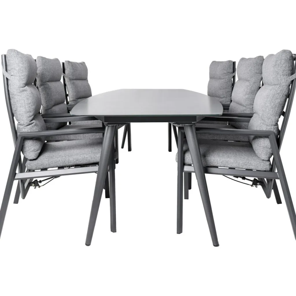 De rugleuningen van de stoelen zijn traploos verstelbaar door middel van de knop op de armleuning. Hierdoor kunt u tijdens het verstellen van de stoel comfortabel blijven zitten. Het aluminium frame van de stoelen is weerbestendig, zodat de stoelen zonder kussens altijd buiten kunnen blijven staan.