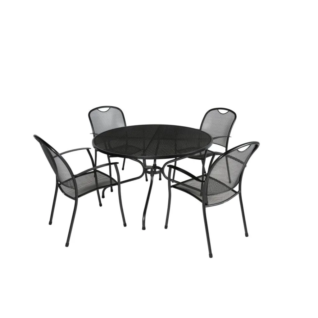 De ENGARDEN by Kettler Strek 120 Kos tuinset bevat een tafel en vier stoelen die stapelbaar zijn, waardoor u kostbare ruimte kunt besparen. De stoelen zijn vervaardigd van strekmetaal, wat een glad oppervlak biedt en comfortabel aanvoelt. De ronde tafel, met stevige stalen poten, is licht van gewicht en UV-bestendig. Met een hoogte van 72 centimeter biedt de tafel comfortabele zitruimte. Zowel de tafel als de stoelen zijn ontworpen om verschillende weersomstandigheden te weerstaan.