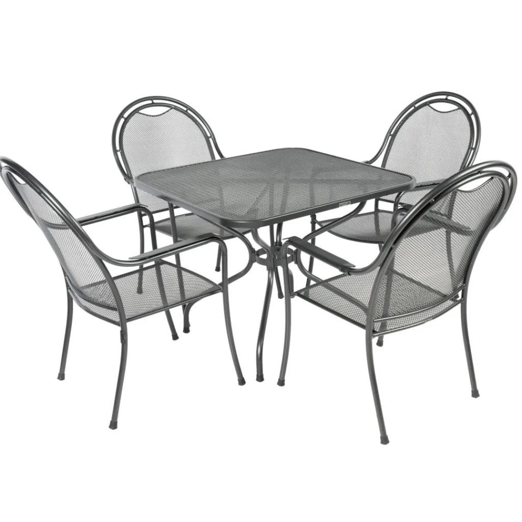 De ENGARDEN by Kettler Strek 90 x 90 Ferrol tuinset omvat een tafel met vier stoelen. De stoelen zijn stapelbaar, waardoor u ruimte kunt optimaliseren. Ze zijn vervaardigd van strekmetaal, wat een glad oppervlak biedt en comfortabel aanvoelt. De vierkante tafel is licht van gewicht, staat stevig dankzij de stalen poten en is bestand tegen UV-straling. Zowel de tafel als de stoelen zijn ontworpen om alle weersomstandigheden te doorstaan.