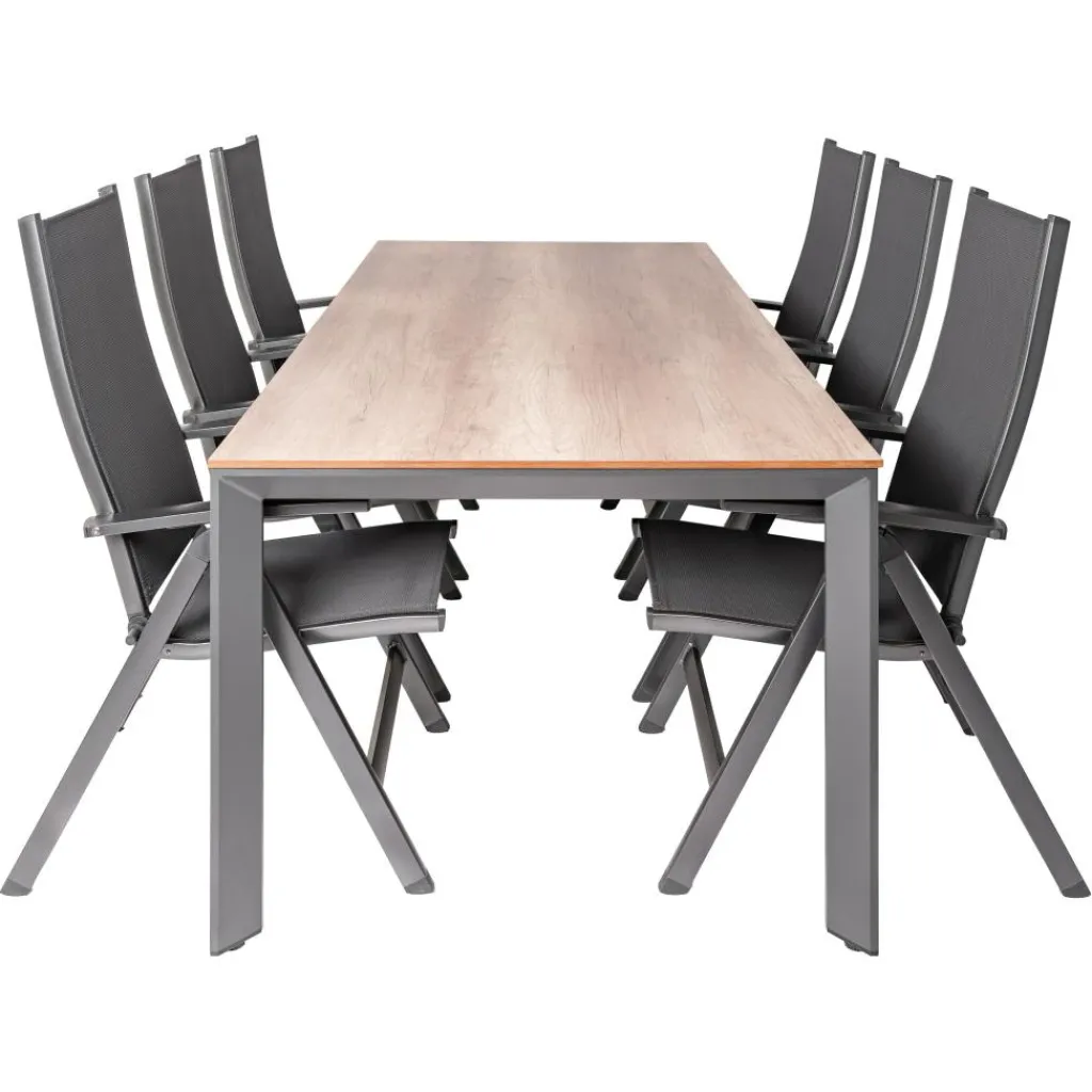 Deze SENS-Line Elena Easy 220 x 100 cm tuinset is weerbestendig, waardoor de set elk seizoen buiten kan staan. De lichtgewicht Easy stoelen zijn verstelbaar en inklapbaar, voor eenvoudig opbergen. Door de combinatie van het strakke frame en het houtmotief tafelblad krijgt deze tuinset een moderne look die bij elke trend past. Het materiaal is onderhoudsarm, zodat u langdurig kunt genieten van de set.