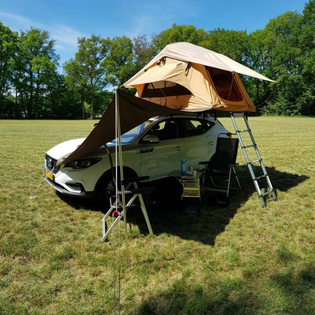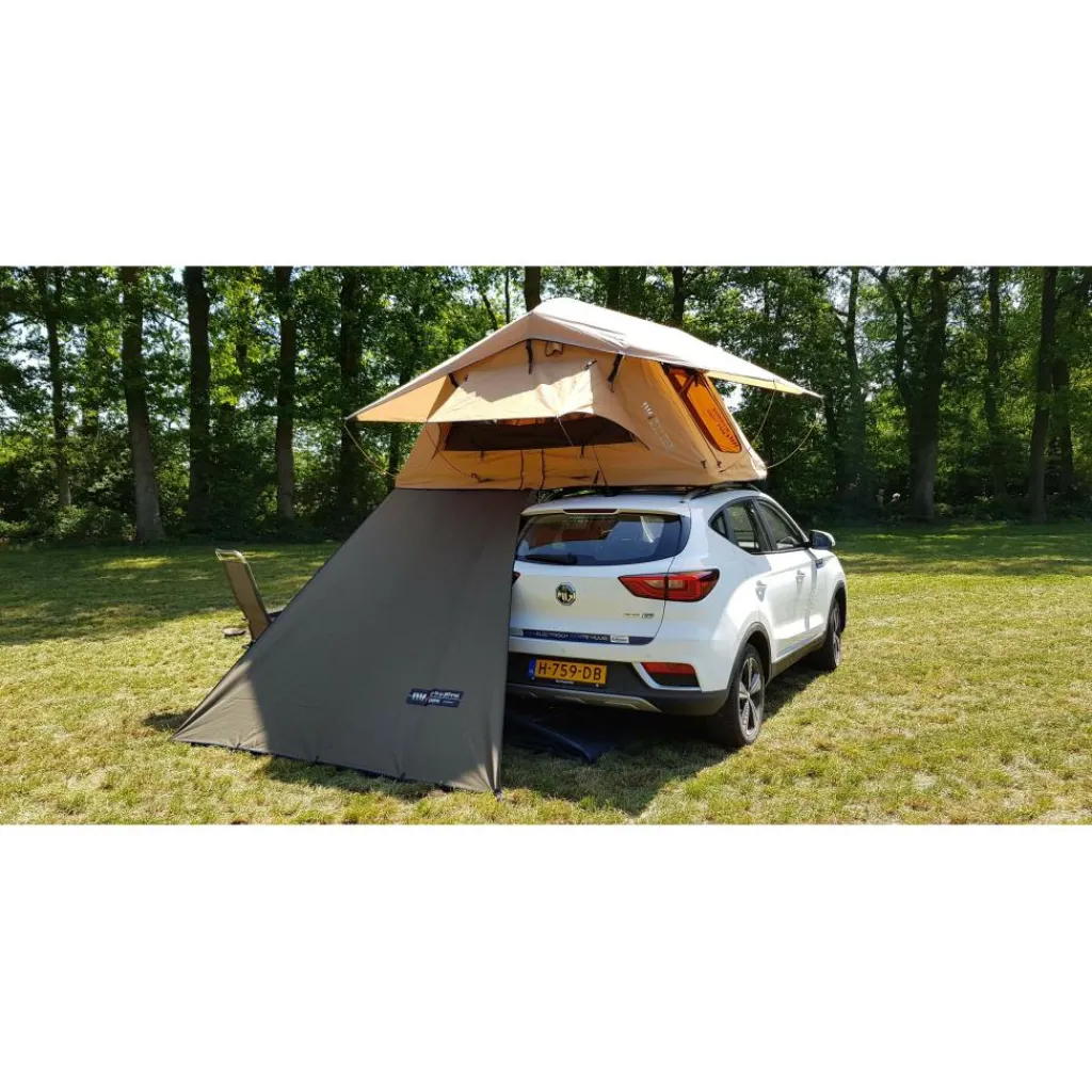 Met de Dare to be Different Outdoor schuifwand in de kleur groen kunt u een beschut plekje creëren om uit de zon en regen te zitten. Deze Dare to be Different Outdoor schuifwand is binnen 3 minuten opgezet en is gemaakt van 300g canvan met een PU-coating. Dit materiaal is waterdicht tot 2500mm, ripstop en UV-bestendig. Bij deze schuifwand ontvangt u 5 haringen en scheerlijnen. Daarnaast is de schuifwand trapeziumvormig, met een kader pees van 125 cm, waarmee u de wand kunt bevestigen aan de peesrand aan de onderzijde van de daktent. U kunt optioneel de schuifwand omtoveren tot een luifel met een los verkrijgbare tentstok.