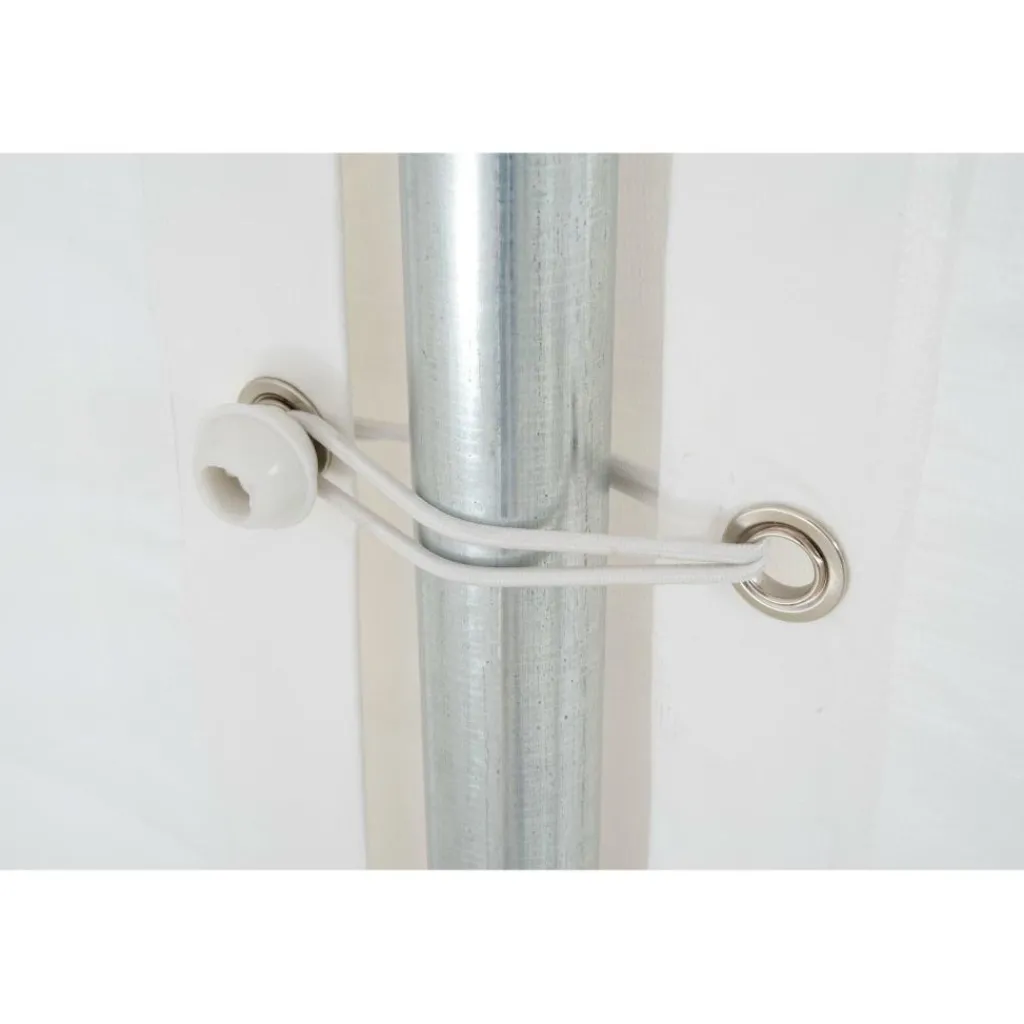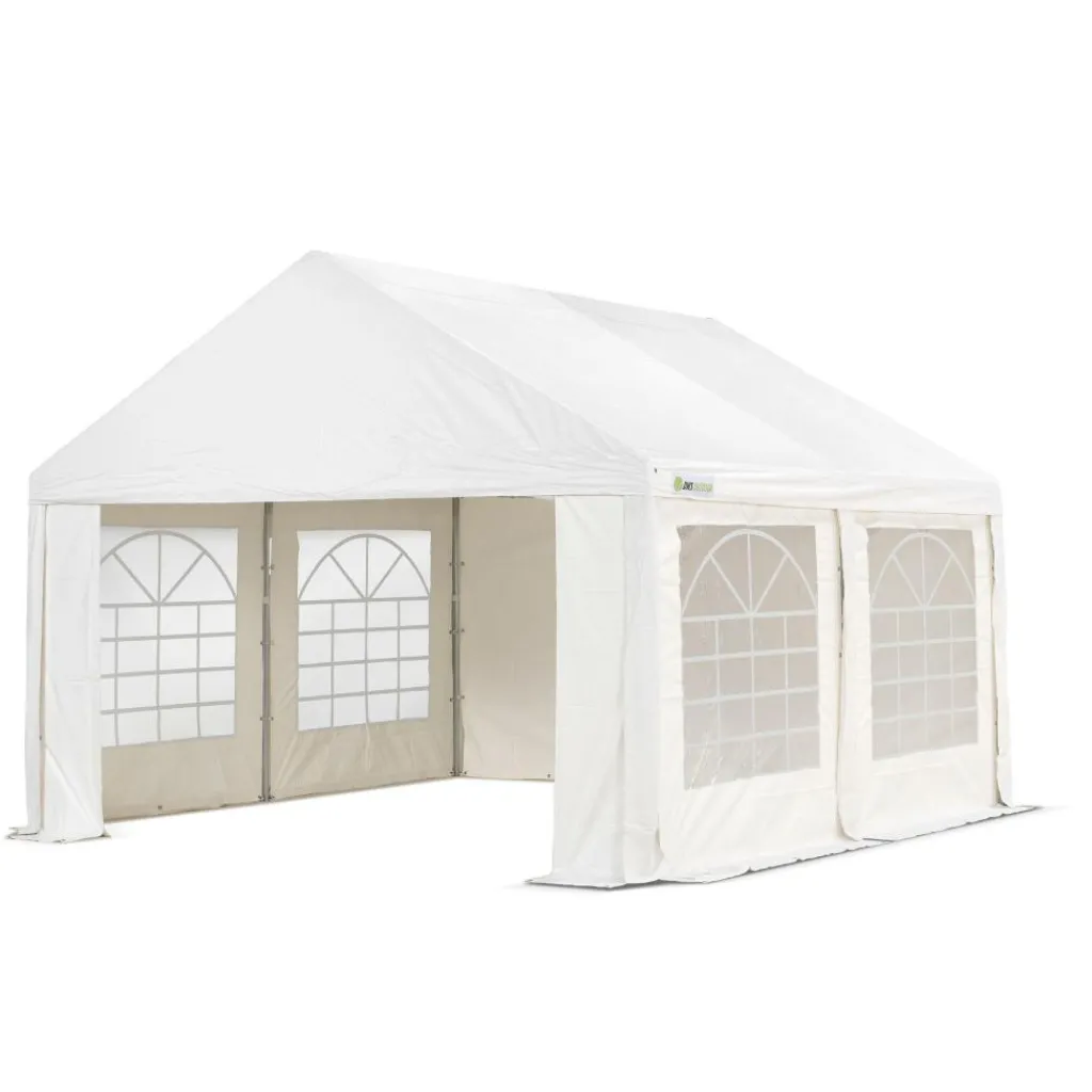 Het dakdoek van 500 g/m² PVC is dicht geweven en zwaar genoeg om regen buiten te houden en strak te blijven staan, zodat water minder makkelijk blijft liggen. De zijwanden van 380 g/m² PVC zijn lichter voor soepelere montage, maar bieden volop beschutting tegen wind en inkijk. Het frame is opgebouwd uit gegalvaniseerde stalen buizen van 38 mm. De zinklaag beschermt tegen roest en zorgt voor een stijve constructie die herhaald op- en afbouwen goed aankan.