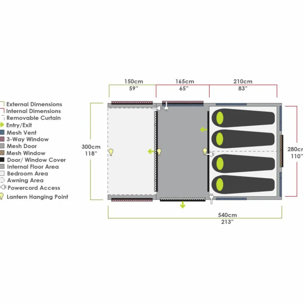 De Zempire EVO TM V2 biedt twee slaapcabines van 210 x 140 cm, gescheiden met een uitneembare scheidingswand. Zo kiest u één grote familiecabine of twee aparte slaapkamers, elk met eigen toegang. De leefruimte heeft een zij-ingang en een horraam voor extra ventilatie, terwijl de vaste vloer alles netjes droog en insectvrij houdt. Voor de tent zit een 150 cm diepe luifel met stormflappen, ideaal als u droog of even uit de zon wilt zitten. Met 210 cm stahoogte voorin en 200 cm achterin beweegt u zich overal makkelijk en rechtop door de tent.