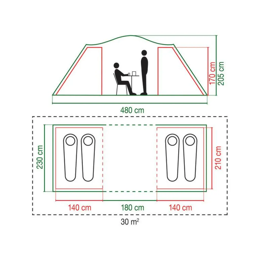 De Spruce Falls 4 is 480 x 230 cm en benut de ruimte efficiënt. In het hart van de tent heeft u een leefruimte van 230 x 180 cm met voldoende hoogte (tot 205 cm) voor een tafel en stoelen. Aan beide uiteinden bevindt zich een slaapcabine van 230 x 140 cm. De vis‑à‑vis indeling geeft twee aparte ‘domeinen’ met privacy en een rustige doorgang in het midden. De voor- en achterkant lopen op tot ongeveer 160 cm hoogte, zodat u ook aan de uiteinden bruikbare bergruimte houdt voor tassen en schoenen. Deze opzet werkt bijzonder prettig voor een gezin van vier of twee stellen die apart willen slapen zonder in te leveren op gezamenlijke leefruimte.