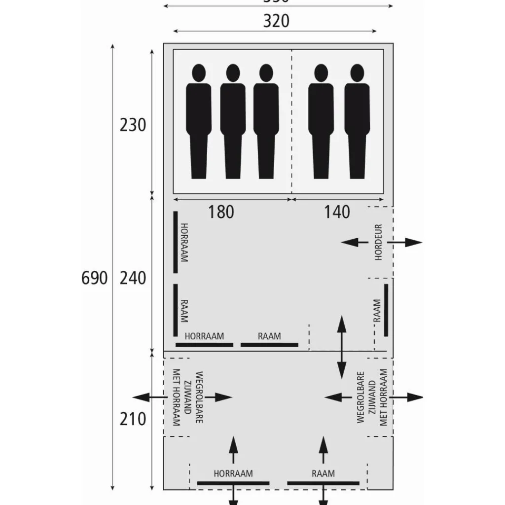 Voorin treft u een royale luifel met combiwand en wegrolbare zijdeuren met horramen. Dit geeft u flexibiliteit: volledig dicht bij wind of regen, of juist luchtig en insectenvrij bij warm weer. De leefruimte is ruim en toegankelijk met een extra brede voordeur en een handige zij-ingang. Zo loopt u elkaar niet in de weg en ventileert de tent sneller bij hitte. Achterin liggen twee slaapcabines voor maximaal vijf personen. De scheidingswand ritst u eenvoudig los om één grote cabine te maken en dankzij de lengte van 230 cm slapen ook langere kampeerders comfortabel.