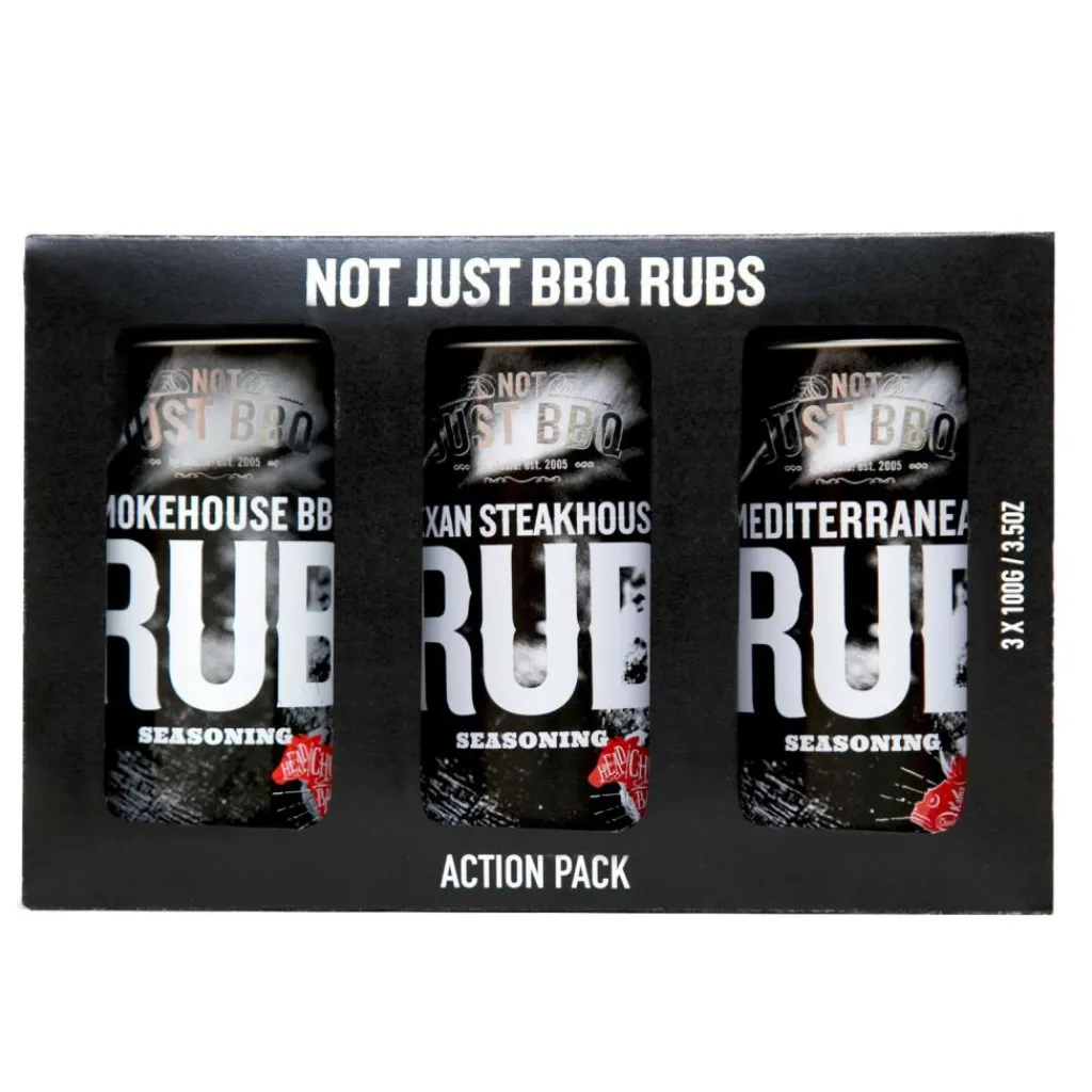 De Not Just BBQ Multipack BBQ Rubs geschenkset bestaat uit drie verschillende kruidenrubs: Texan Steakhouse, Smokehouse BBQ en Mediterranean. De rubs uit deze geschenkset van Not Just BBQ smaken heerlijk in combinatie met vis, zeevruchten of rundvlees.