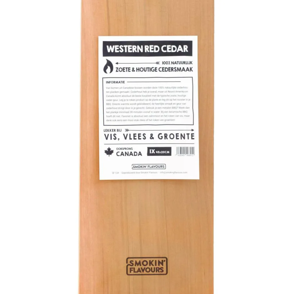 De Smokin’ Flavours Cederhouten rookplank is gemaakt van bomen uit de Canadese bossen en is dus 100% natuurlijk cederhout. Uit Noord-Amerika en Canada komen de beste kwaliteit cederhout voor met een zoete en houtige geur. Op deze Smokin’ Flavours rookplank ligt u uw product en dit legt u vervolgens op de barbecue. Directe warmte wordt door de plank geblokkeerd maar de smaak en geur van cederhout trekt wel in uw gerecht.