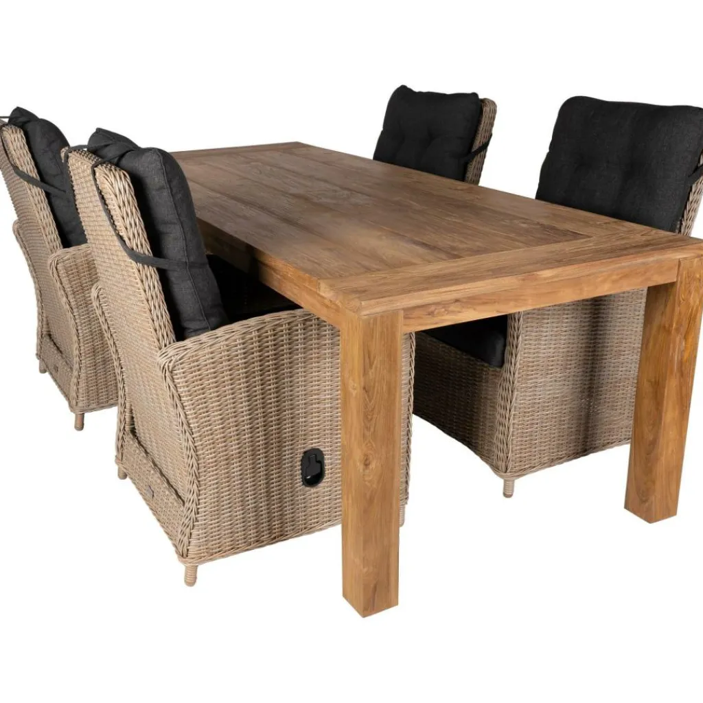 De Bardani Roma 240 Atlantic 4 tuinset is geschikt voor vier personen en komt in de kleurencombinatie van teak met mexican sand. Bij deze Bardani tuinset worden de vier verstelbare Atlantic tuinstoelen gecombineerd met de Roma tuintafel. De tuinstoelen hebben een verstelbare rugleuning en worden geleverd inclusief de kussens getoond op de afbeeldingen. Het aluminium frame is licht van gewicht en afgewerkt met wicker. Dit maakt de stoelen erg duurzaam en onderhoudsvriendelijk. De Roma tuintafel is door zijn teakhouten constructie erg duurzam en stevig. Deze houtsoort is ongevoelig voor rot en vocht. De Bardani tuintafel zal na verloop van tijd wel gaan vergrijzen, maar dat is te verhelpen met een protector.