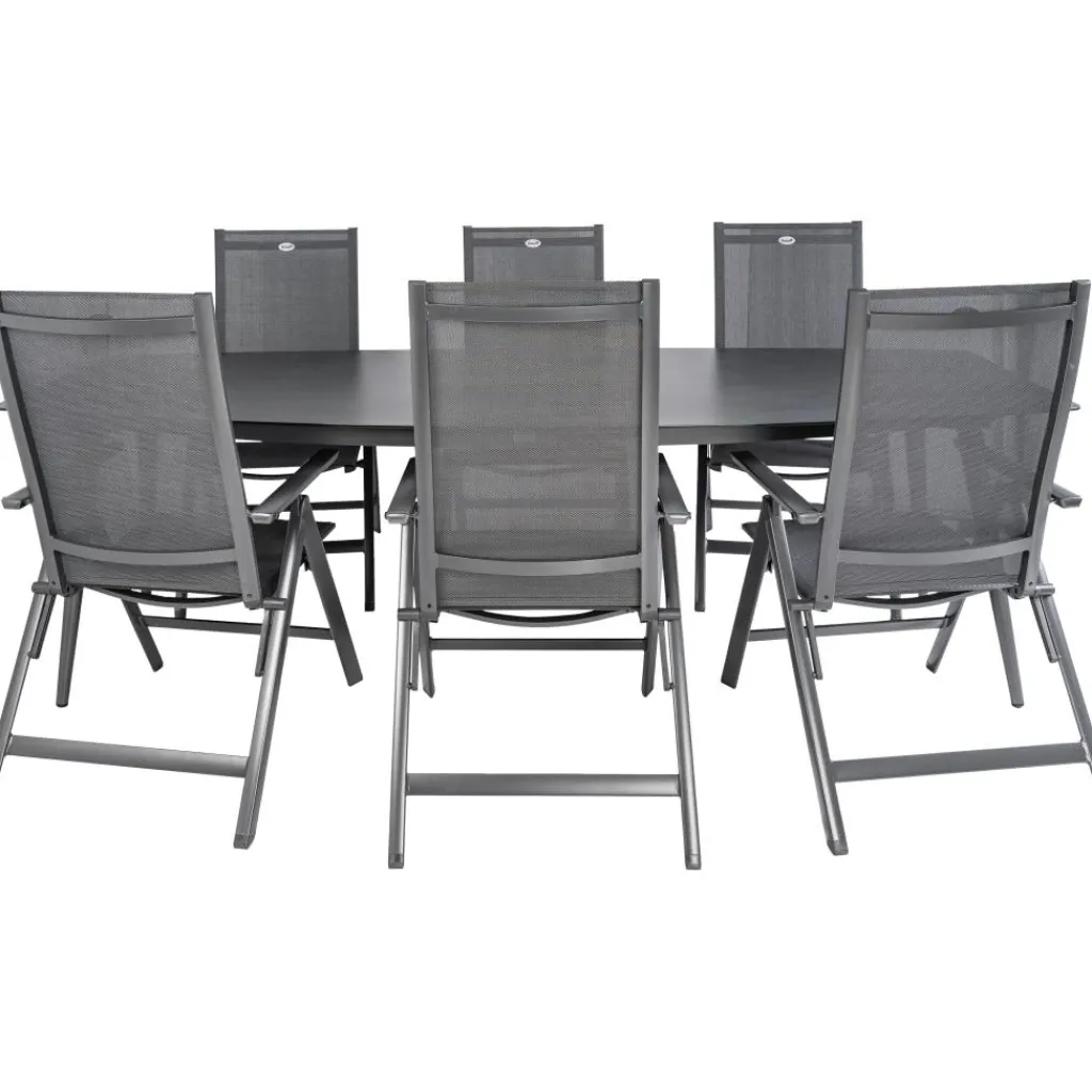 De stoelen zijn voorzien van armleuningen, waarmee de rugleuningen versteld kunnen worden voor een comfortabele zithouding. De materialen zijn bestand tegen de weersinvloeden, waardoor ze makkelijk zijn in onderhoud.