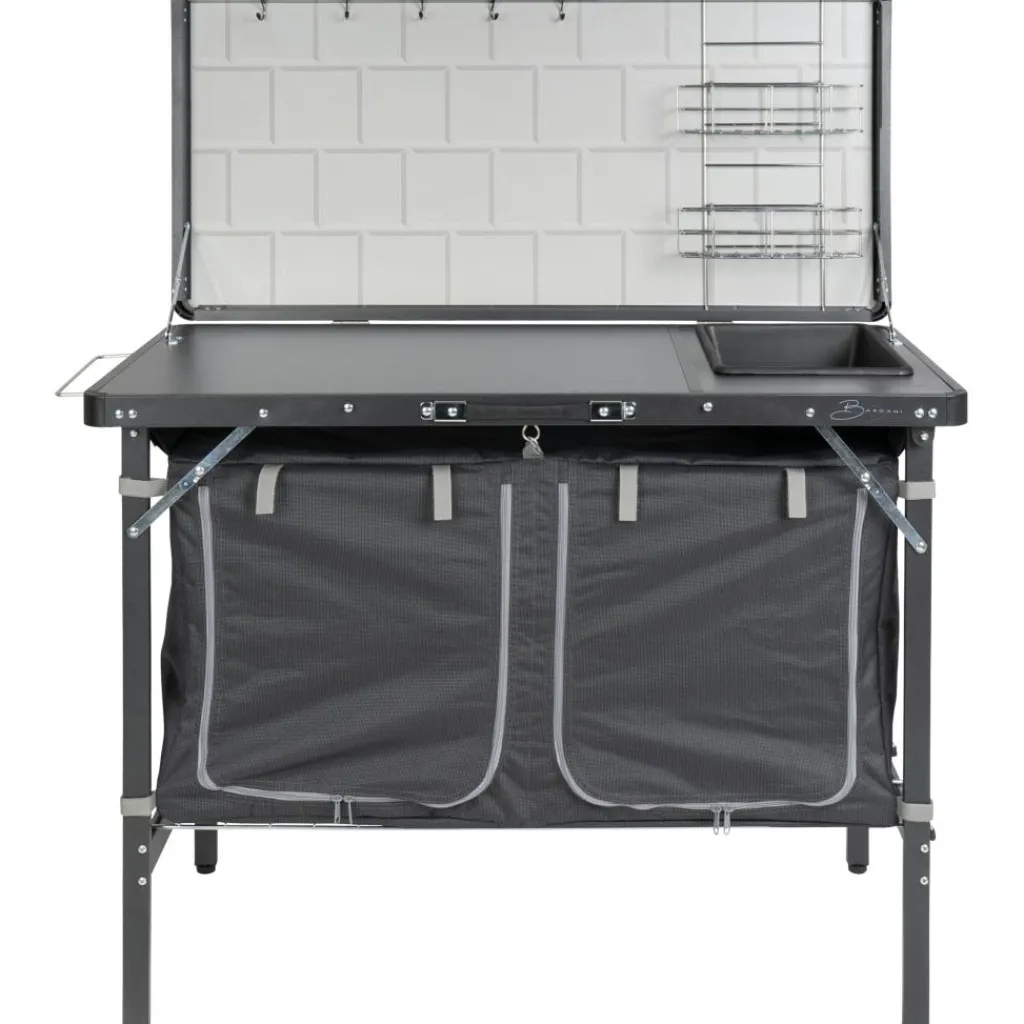 De Bardani Salamanca campingkeuken is een hele complete kampeerkeuken die plat op te vouwen is tijdens het vervoer. Deze Bardani campingkeuken heeft een luxe uitgevoerd topblad met een wasbakje, 2 opbergrekjes en 6 ophanghaakjes. Onder het blad is opbergruimte die toegankelijk is via een van de 2 ritsdeuren.